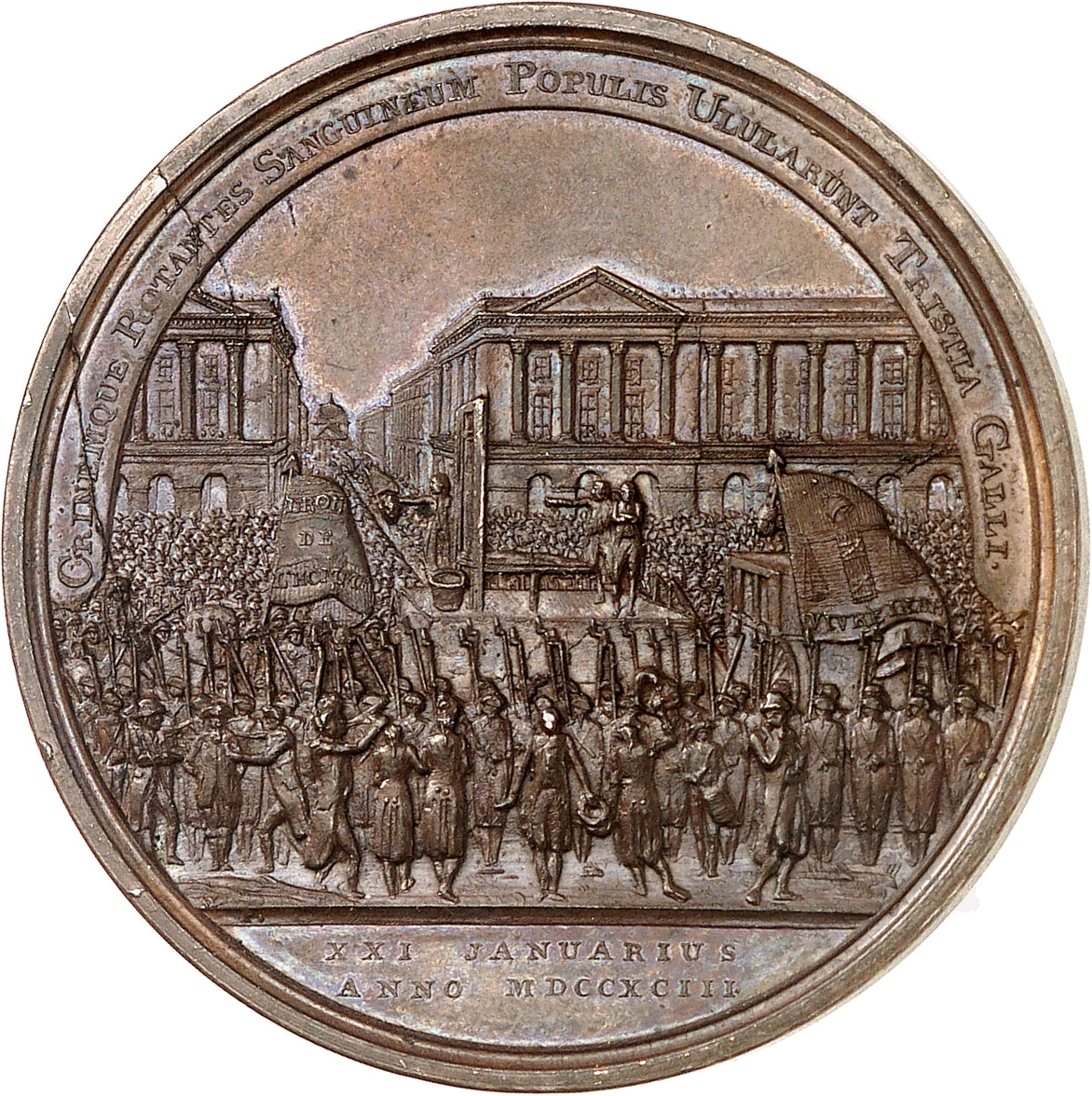 Rv. CRINEMQUE ROTANTES SANGUINEUM POPULIS ULULARUNT TRISTIA GALLI. Vue de la Place de la Révolution (ancienne Place royale, actuelle place de la Concorde) avec la scène de l’exécution du roi Louis XVI au moment où le bourreau montre la tête décapitée de ce dernier. À l’exergue : XXI JANUARIUS / ANNO MDCCXCIII.