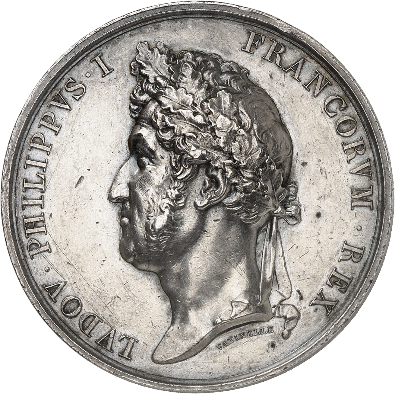 Av. LVDOV. PHILIPPVS. I - FRANCORVM. REX. Buste lauré de chêne à gauche de Louis-Philippe Ier ; au-dessous, signature VATINELLE.