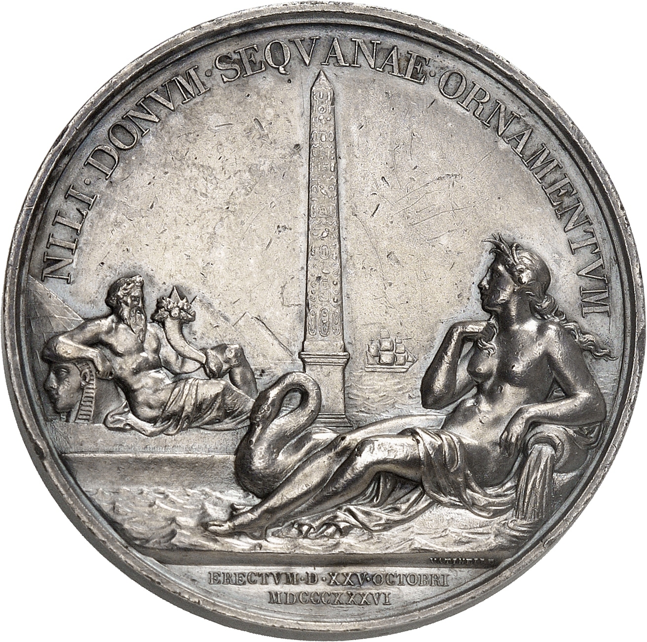 Rv. NILI. DONVM. SEQVANAE. ORNAMENTVM. L'obélisque de Louxor entre le Nil et la Seine, en arrière-plan, trois-mâts sur la mer ; signature VATINELLE et à l'exergue : ERECTVM. D. XXV. OCTOBRI/ MDCCCXXXVI.