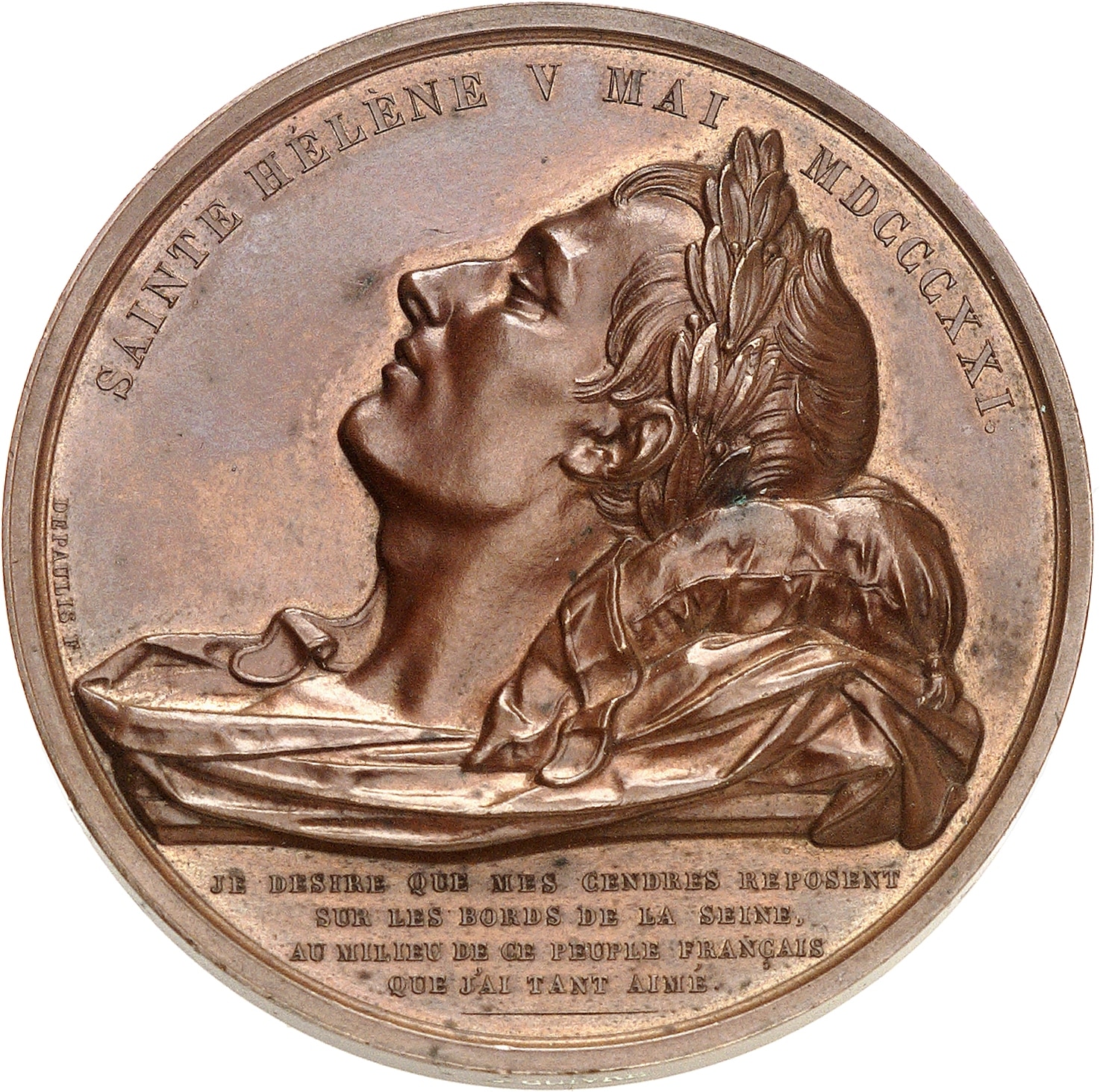 Av. SAINTE HÉLÈNE V MAI - MDCCCXXI, Buste lauré de Napoléon Ier, couché sur son lit de mort ; à l'exergue : JE DÉSIRE QUE MES CENDRES REPOSENT/ SUR LES BORDS DE LA SEINE,/ AU MILIEU DE CE PEUPLE FRANÇAIS/ QUE J'AI TANT AIMÉ ; signature DEPAULIS F.