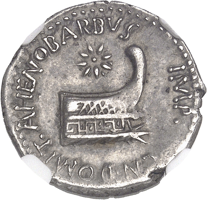 Rv. CN· DOMIT· AHENOBARBVS - IMP. Proue à droite ; au-dessus, une étoile.