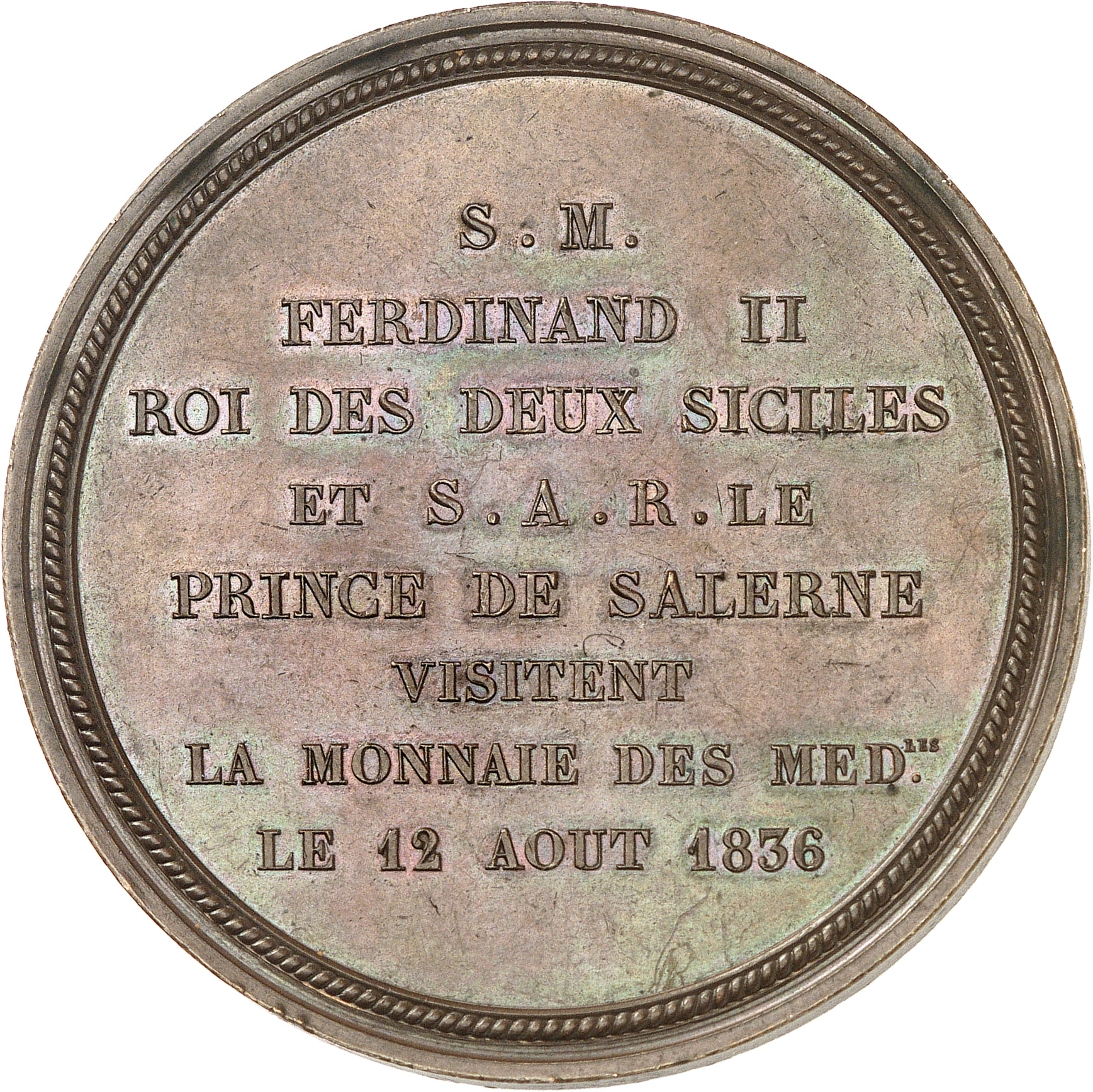 Rv. Inscriptions en 8 lignes : S. M./ FERDINAND II/ ROI DES DEUX SICILES/ ET S. A. R. LE/ PRINCE DE SALERNE/ VISITENT/ LA MONNAIE DES MEDles/ LE 12 AOUT 1836.