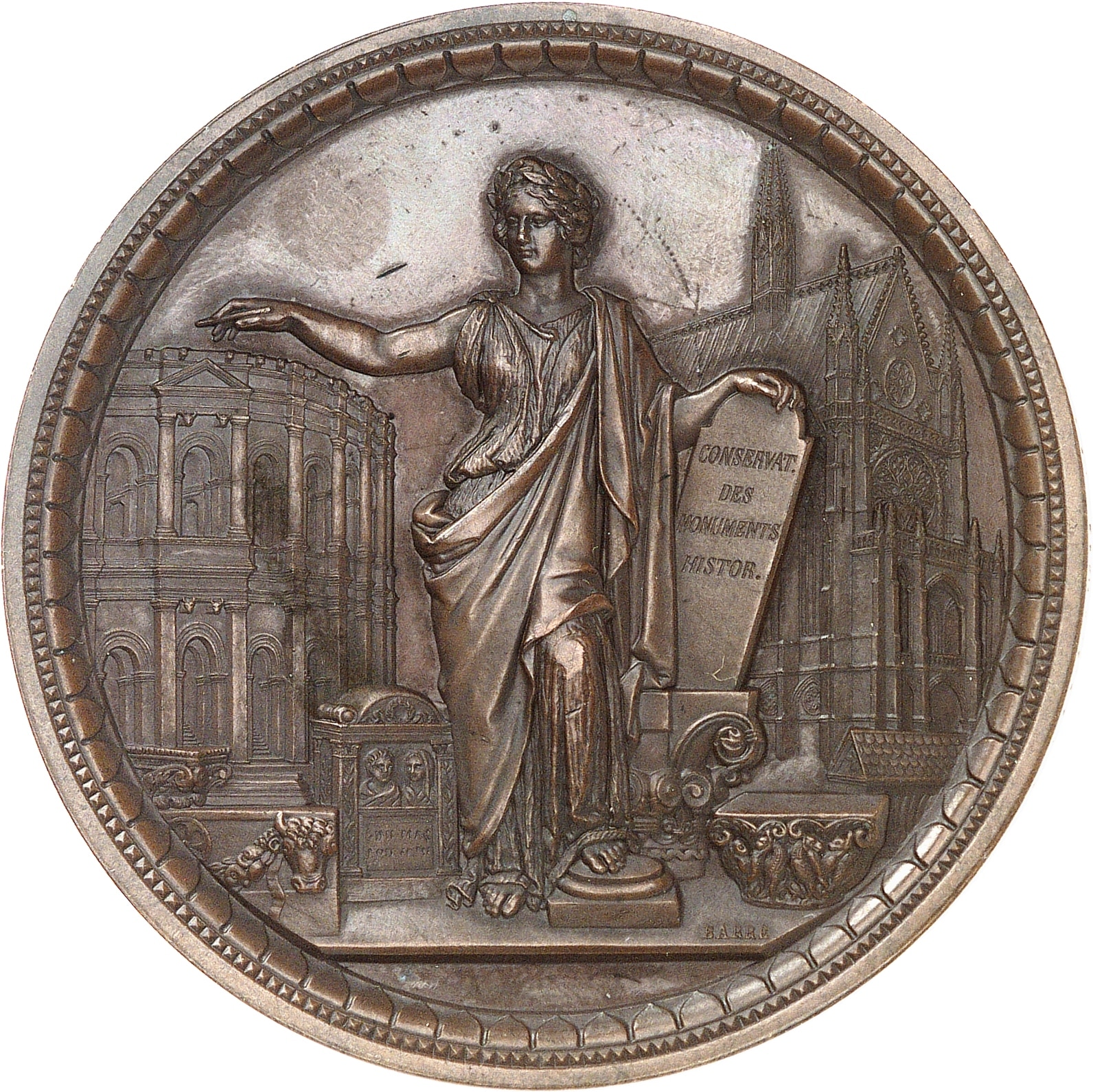 Rv. Muse antique tenant une table inscrite CONSERVAT./ DES/ MONUMENTS/ HISTOR. ; divers monuments derrière elle et autour. À l'exergue signature BARRE.