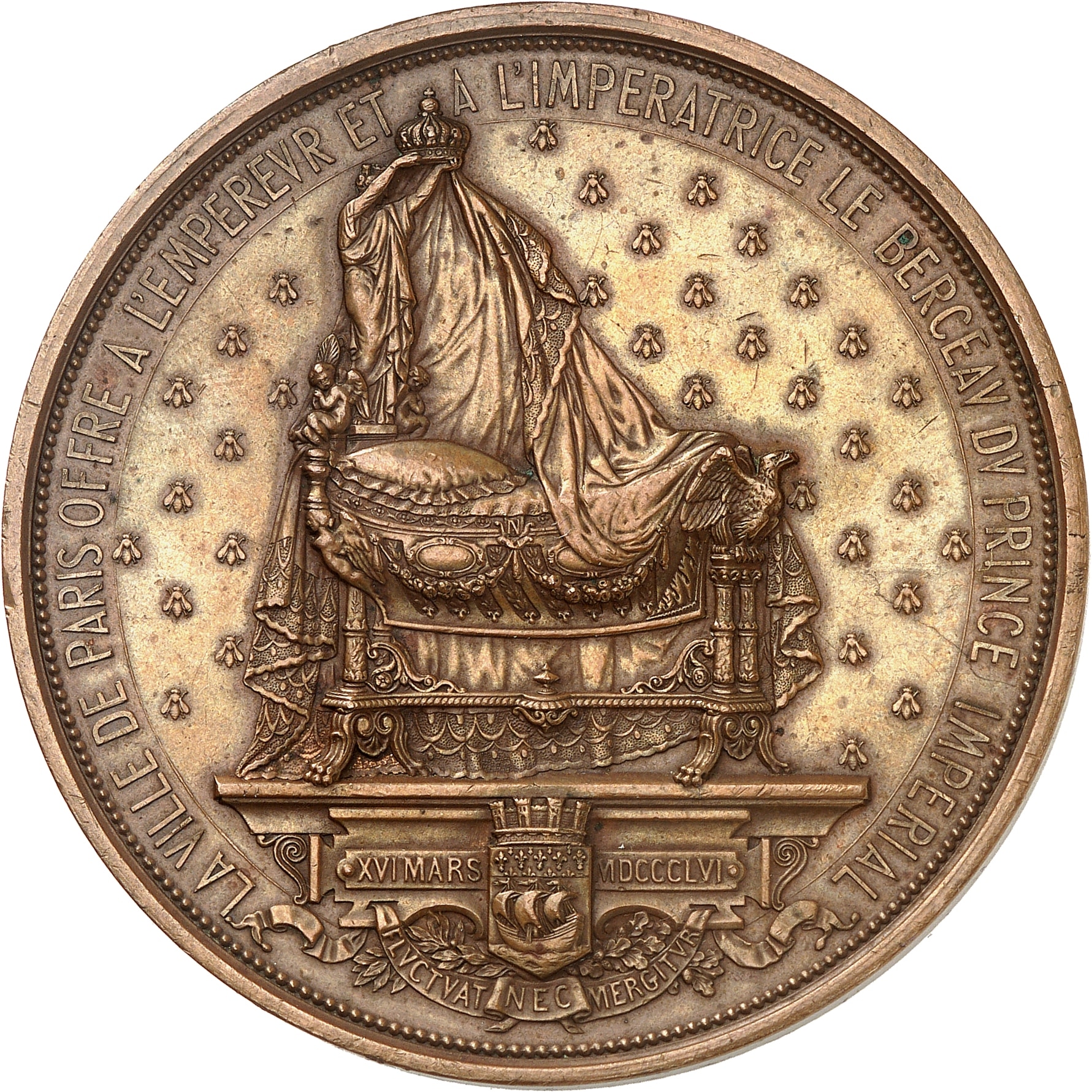 Av. LA VILLE DE PARIS OFFRE A L'EMPEREVR ET A L'IMPERATRICE LE BERCEAV DV PRINCE IMPERIAL. Dans un champ semé d'abeilles, le berceau impérial posé sur un socle aux armes de Paris, avec inscriptions XVI MARS MDCCCLVI et FLVCTVAT NEC MERGITVR.