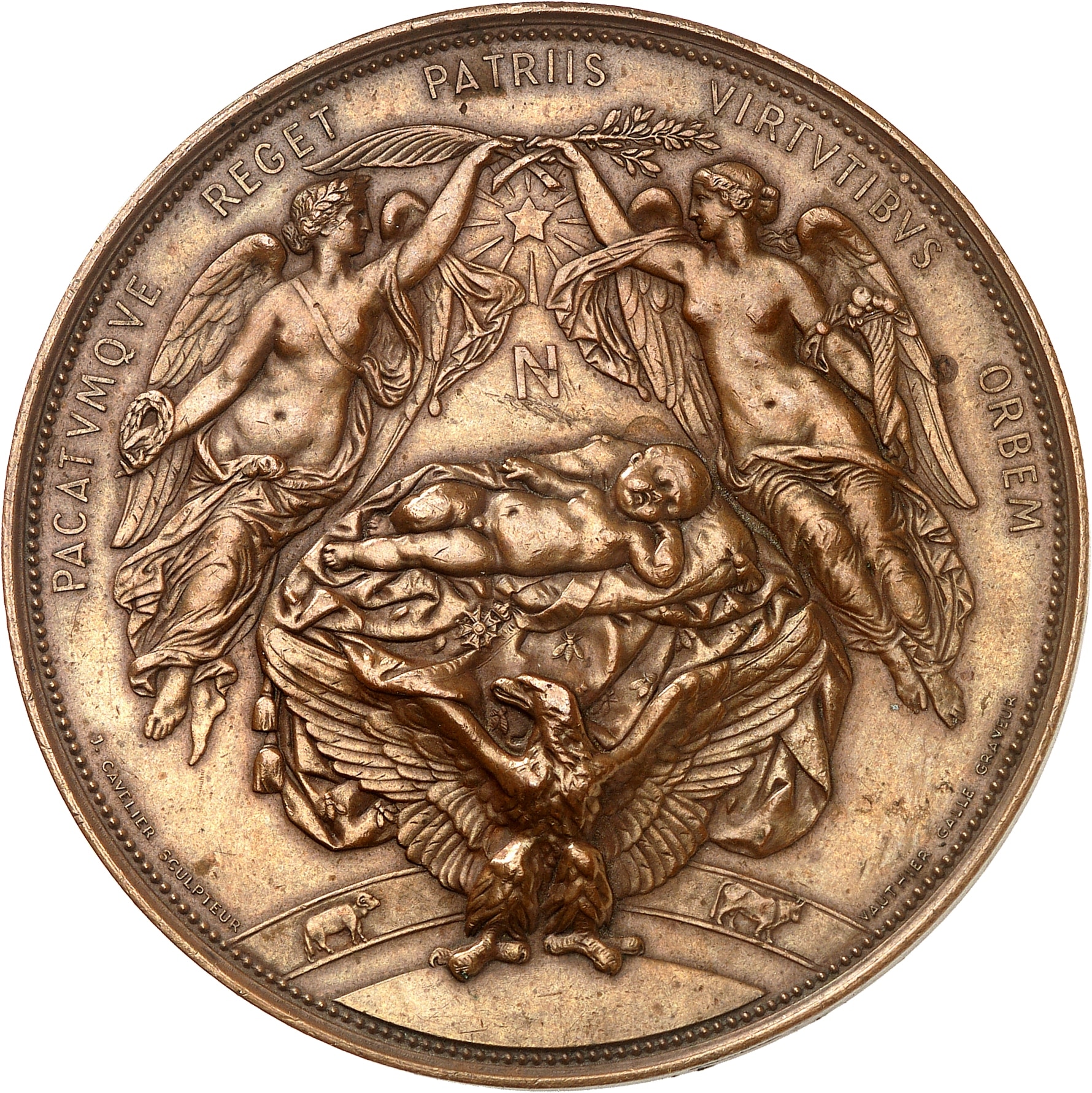 Rv. PACATVMQVE REGET PATRIIS VIRTVTIBVS ORBEM. L'aigle impérial supportant le nouveau-né endormi sur un coussin, veillé par la Prospérité et l'Abondance qui le couronnent ; signatures J. CAVELIER SCULPTEUR - VAUTHIER GALLE GRAVEUR.