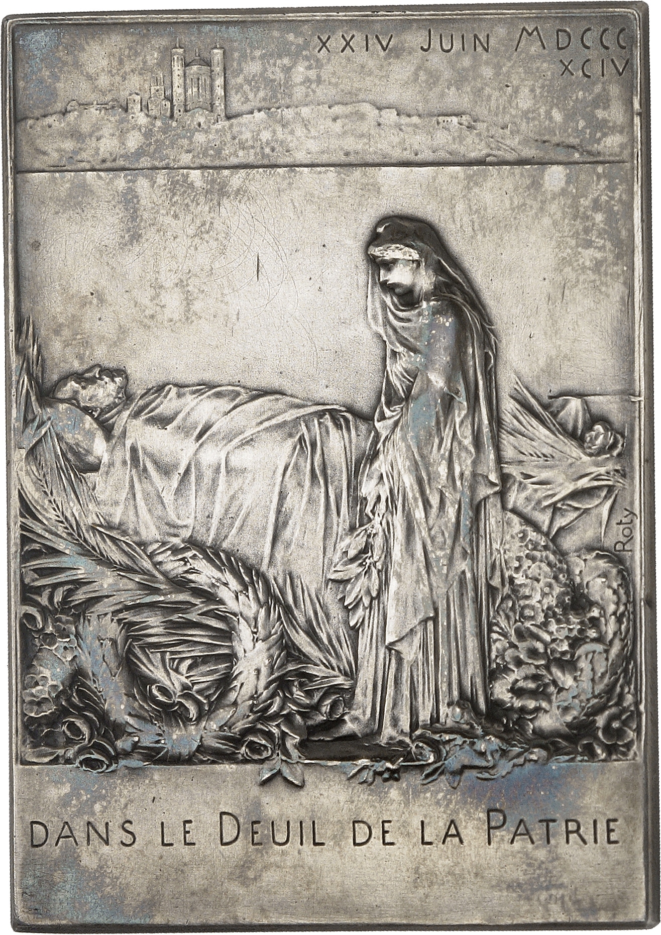 Av. DANS LE DEUIL DE LA PATRIE. La France en train de pleurer le défunt Carnot sur son lit, en arrière-plan la basilique Notre-Dame de Fourvière de Lyon ; XXIV JUIN MDCCCXCIV et signature ROTY.
