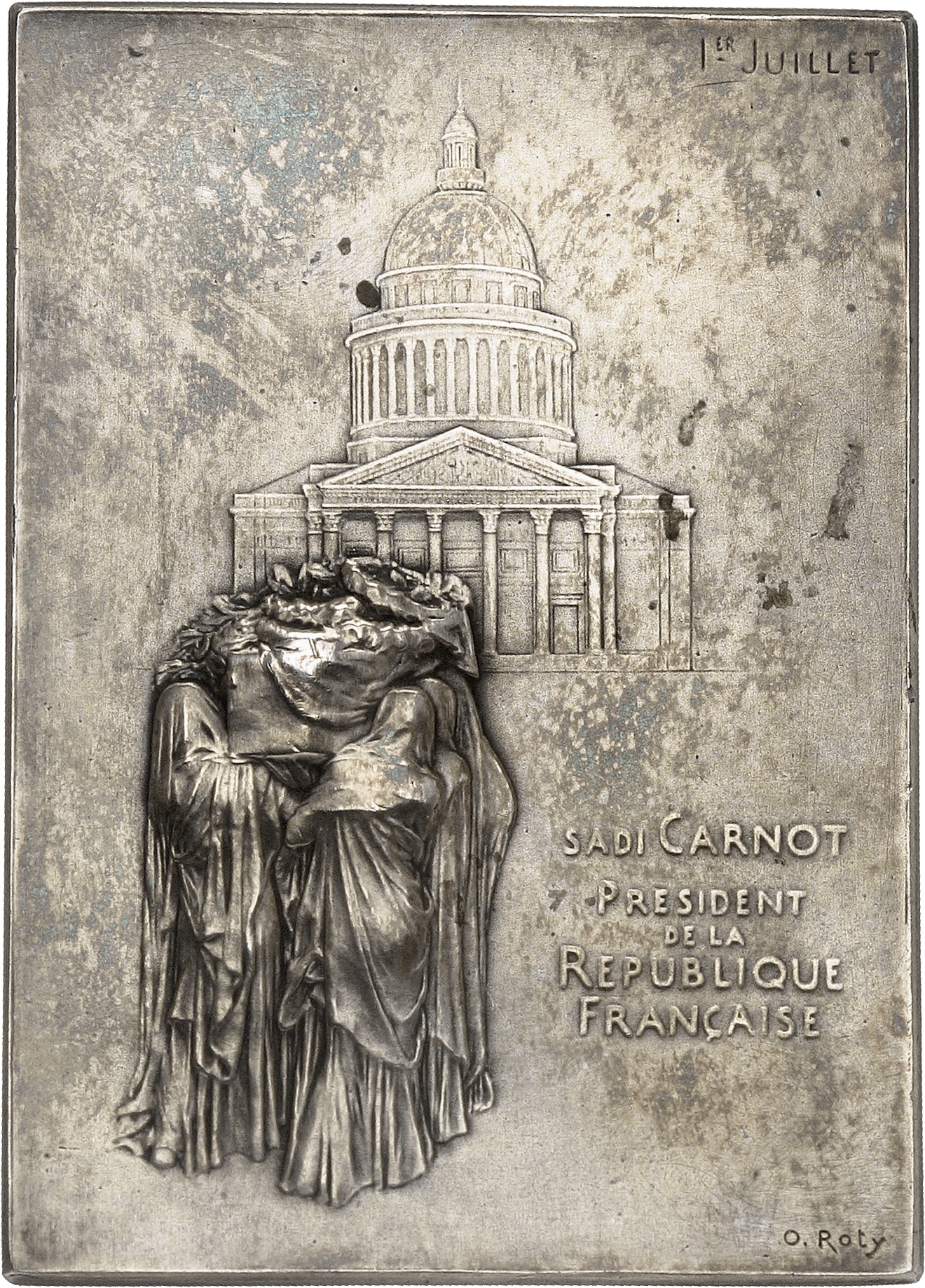 Rv. SADI CARNOT/ PRESIDENT/ DE LA/ REPUBLIQUE/ FRANÇAISE. Figures voilées portant le cercueil de Sadi Carnot au Panthéon ; Ier JUILLET et signature O. ROTY.