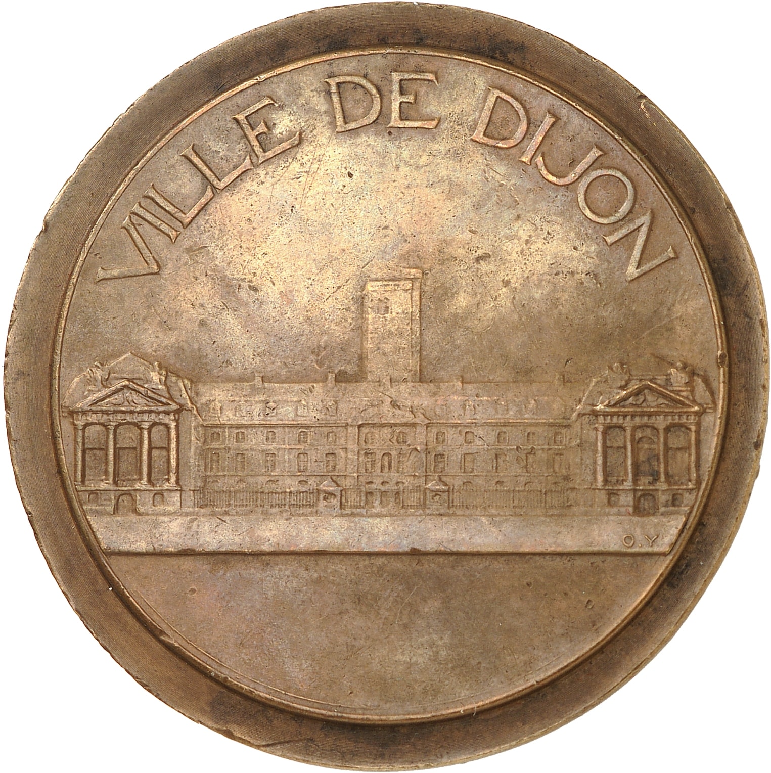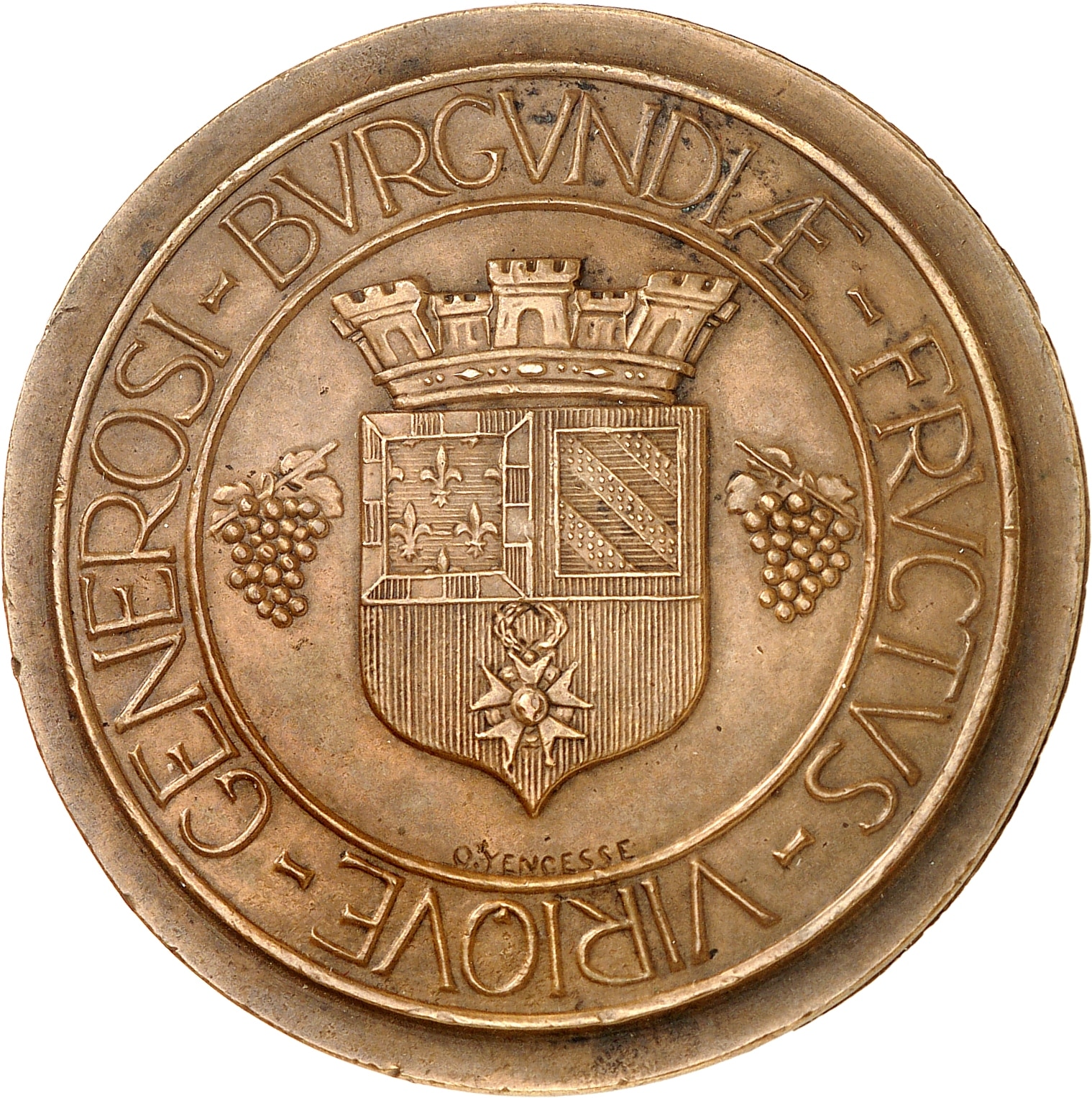 Av. GENEROSI - BVRGVNDIÆ - FRVCTVS - VIRIQVE. Écu aux armoiries de la ville de Dijon (De gueules au chef parti, au premier d'azur semé de fleurs de lys d'or, à la bordure componée d'argent et de gueules, au deuxième bandé d'or et d'azur, à la bordure de gueules, la croix de la Légion d'honneur appendue au chef), entre deux grappes de raison et surmonté d’une couronne crénelée ; signature O. YENCESSE.