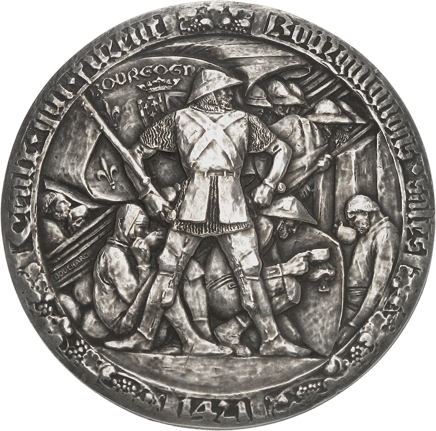 Av. CEUX QUI FURENT BOURGUIGNONS SALÉS / 1421. Soldats bourguignons de la garnison d'Aigues-Mortes, avec écu aux armes de Bourgogne ; signature BOUCHARD.