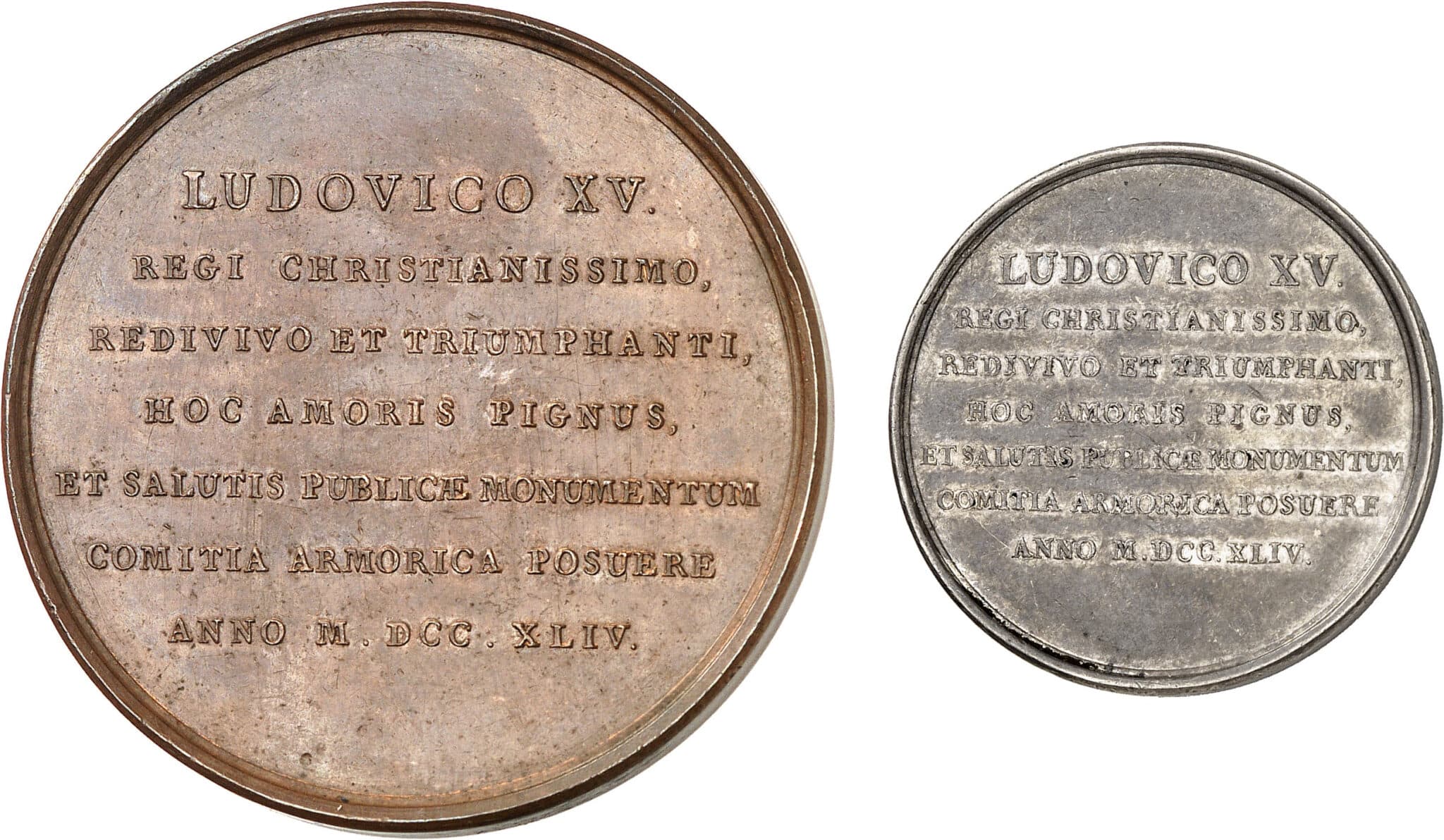 Rv. Inscription en sept lignes : LUDOVICO XV./ REGI CHRISTIANISSIMO,/ REDIVIVO ET TRIUMPHANTI,/ HOC AMORIS PIGNUS,/ ET SALUTIS PUBLICÆ MONUMENTUM/ COMITIA ARMORICA POSUERE/ ANNO (date).