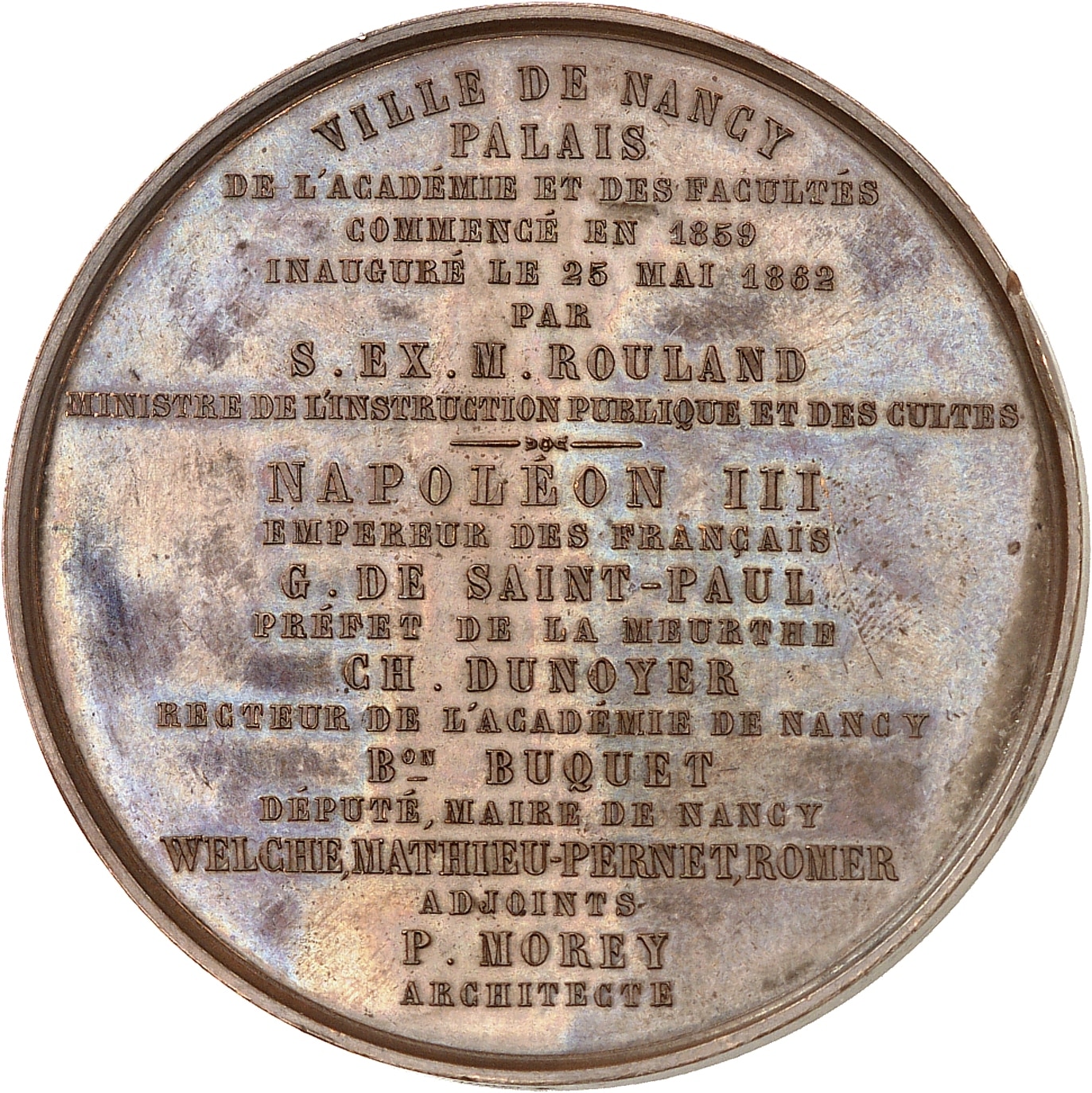 Rv. Inscription en vingt lignes : VILLE DE NANCY/ PALAIS/ DE L'ACADÉMIE ET DES FACULTÉS/ COMMENCÉ EN 1859/ INAUGURÉ LE 25 MAI 1862/ PAR/ S. EX. M. ROULAND/ MINISTRE DE L’INSTRUCTION PUBLIQUE ET DES CULTES/ NAPOLÉON III/ EMPEREUR DES FRANÇAIS/ (etc.).