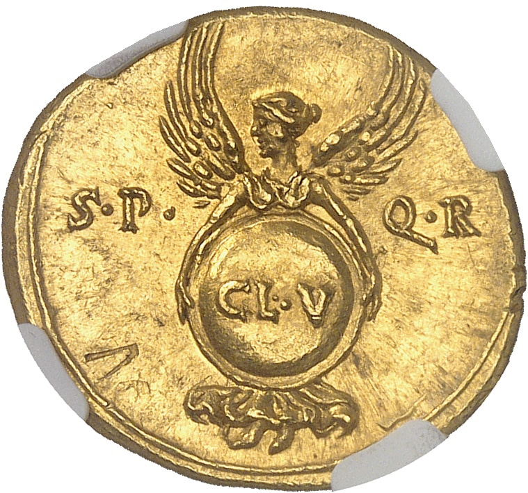 Rv. S·P· - Q· R. Victoire ailée à gauche tenant un bouclier inscrit CL. V (Clipeus Virtutis).