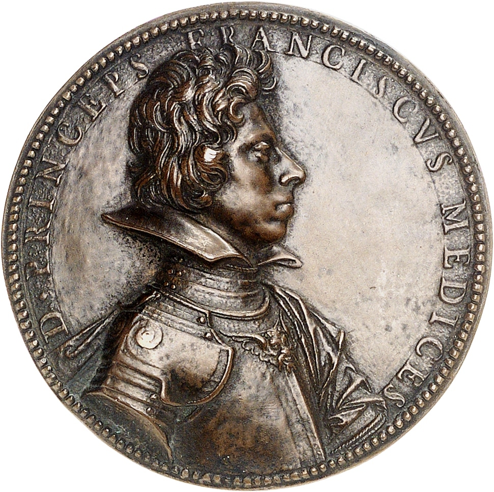 Av. D. PRINCEPS - FRANCISCVS MEDICES. Buste cuirassé à droite de François de Médicis, au-dessous GDP 1613.