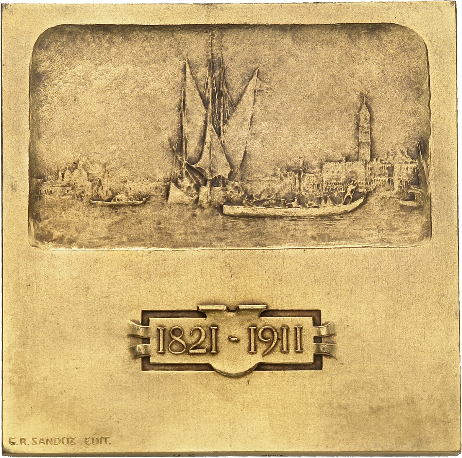 Rv. Représentation du tableau de Ziem “Trabucco et gondoles dans le bassin” ; au-dessous un cartouche avec les dates de l'artiste 1821-1911 et signature G. R. SANDOZ EDIT.