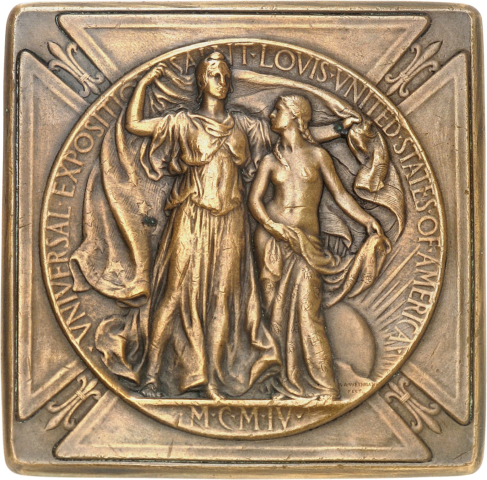 Av. .VNIVERSAL. EXPOSITION. SAINT. LOVIS. VNITED. STATES. OF. AMERICA. Dans un médaillon central portant des fleurs de lys aux angles, allégories féminines debout devant le soleil rayonnant ; à l'exergue (date) ; signature A. A. WEINMAN FECT.