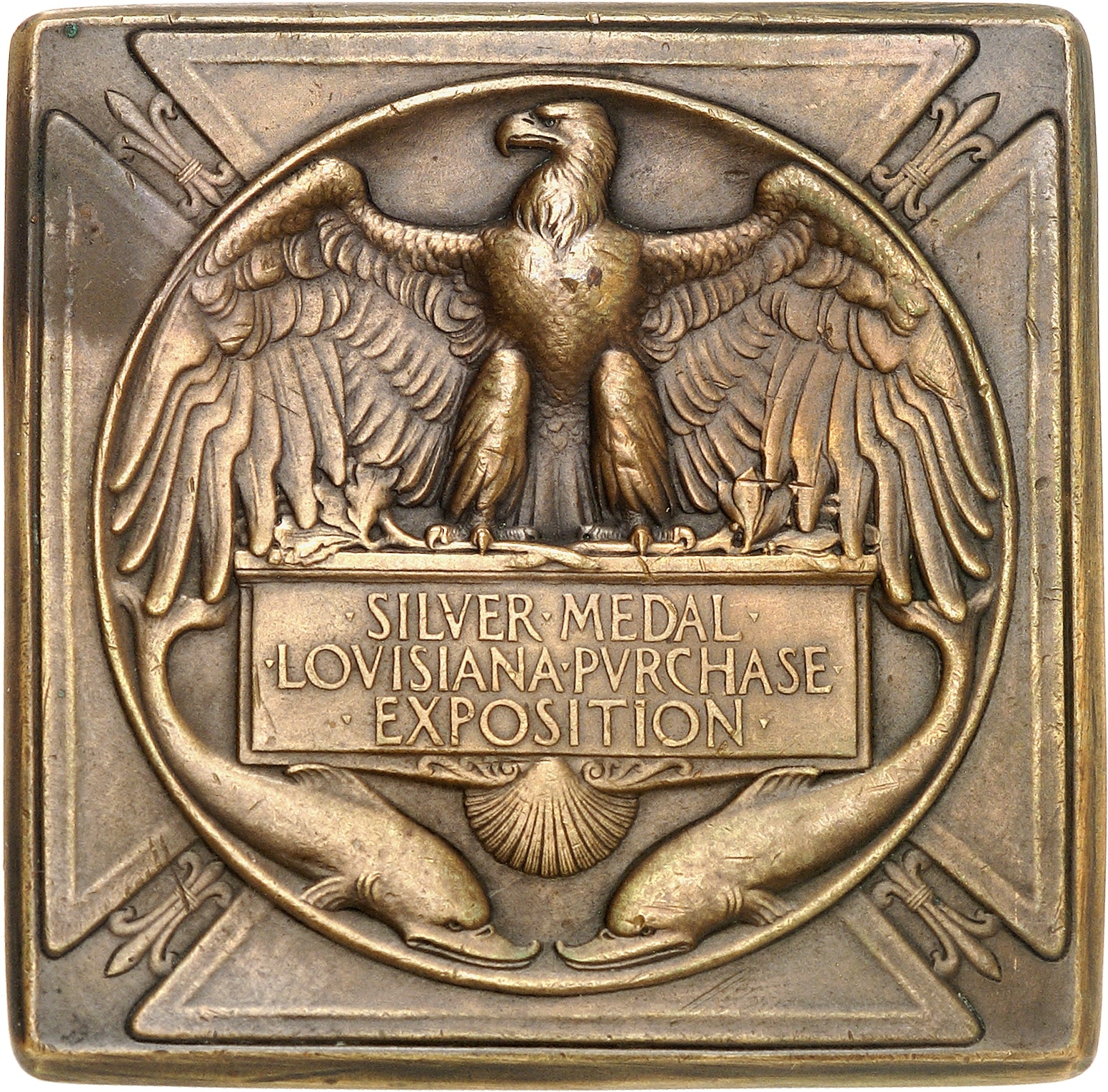Rv. Dans un médaillon central portant des fleurs de lys aux angles, aigle aux ailes déployées. En-dessous cartouche inscrit .SILVER. MEDAL./ .LOVISIANA. PVRCHASE./ .EXPOSITION. et deux dauphins accostant une coquille saint jacques.