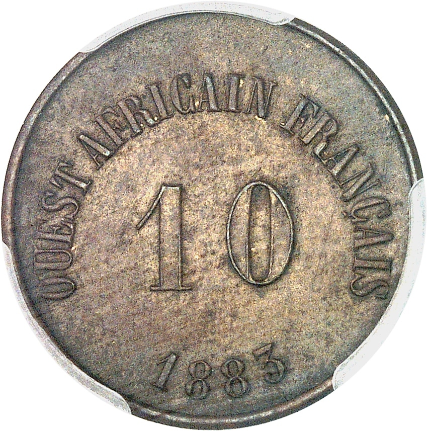 - IIIe République (1870-1940). Jeton de 10 francs (valeur d’échange de 50 francs), Ouest Africain Français (Gabon & Moyen Congo) 1883, Paris.