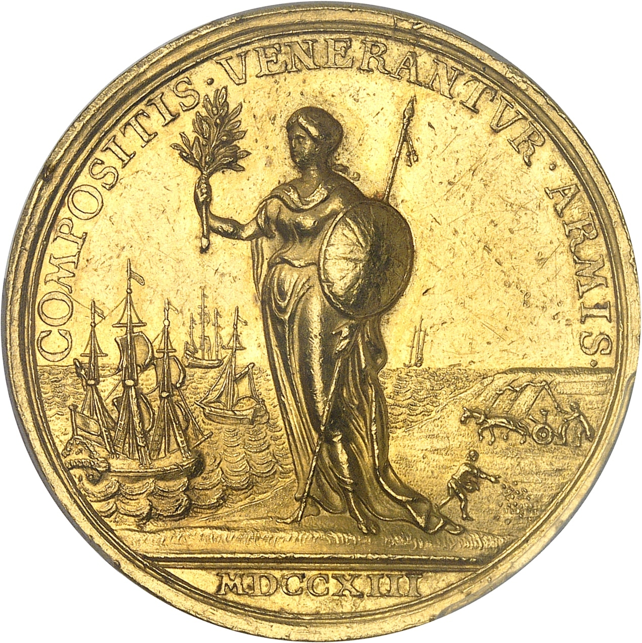Rv. COMPOSITIS. VENERANTVR. ARMIS. Britannia debout à gauche, tenant une lance et un bouclier armorié de la main gauche et une branche d’olivier de la main droite, le tout sur une côte avec scènes agricoles à droite et voilier en mer à gauche ; à l’exergue (date).
