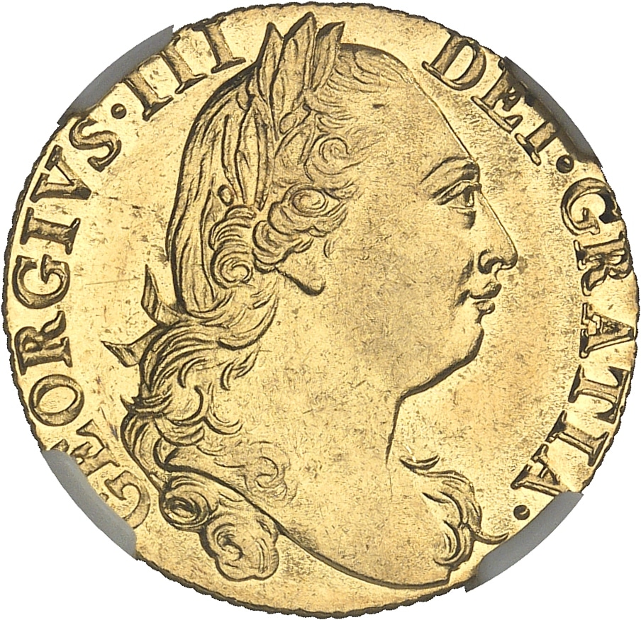 Ce buste est par Thomas Pingo. La légende du droit [GEORGIVS. III - DEI. GRATIA] "Georges le troisième par la grâce de Dieu" est prolongée au revers par la suite de la titulature [M. B. F. ET. H. REX. F. D. B. ET. L. D. S. R. I. A. T. ET. E = M(agnæ) B(ritanniæ) F(ranciæ) ET H(iberniæ) REX F(idei) D(efensor) B(runswick) ET L(unebergensis) D(ux) S(acri) R(omani) I(mperii) A(rchi) T(hesaurius) ET E(lector)"] traduite par "Roi de Grande-Bretagne, France et Irlande, Défenseur de la Foi, Duc de Brunswick and Luneberg, Archi-Trésorier et Électeur du Saint-Empire romain"