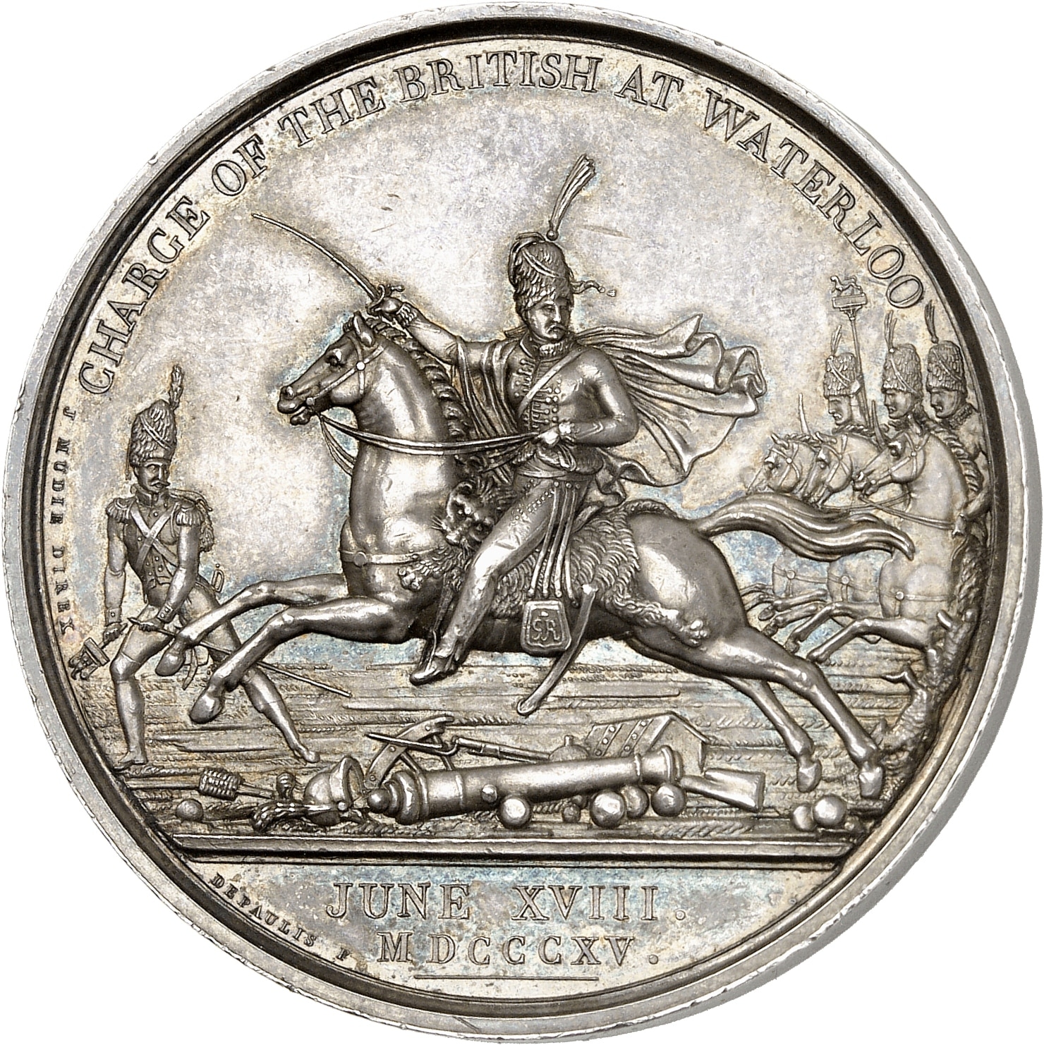 Rv. CHARGE OF THE BRITISH AT WATERLOO. Un officier de cavalerie anglais au galop à gauche, suivi par des cavaliers. Armes au sol. Devant, un garde français brise un aigle ; à l’exergue : JUNE XVIII MDCCCXV et signature DEPAULIS F et J. MUDIE DIREX.