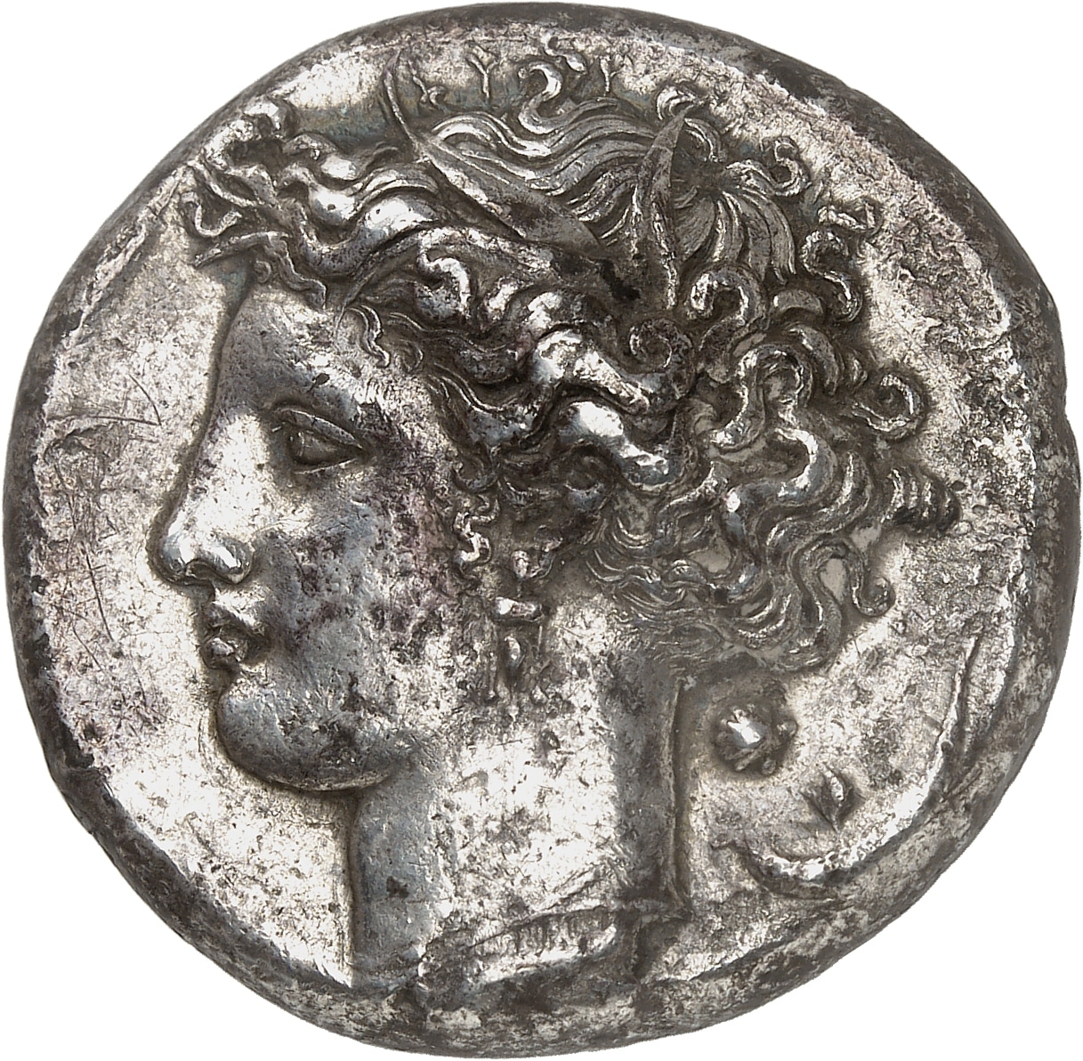 [NGC TOOLED] (8585316-010). Incomplètement lisible, ce décadrachme montre une combinaison avec Σ-Υ-Ρ (///) et la coquille orientée comme le coin Gallatin F.III avec, peut-être, le revers R.XII. Les champs sont corrodés et ont été grattés à l’aiguille. Joli buste, en haut relief. Avec une légère patine. TB à TTB.