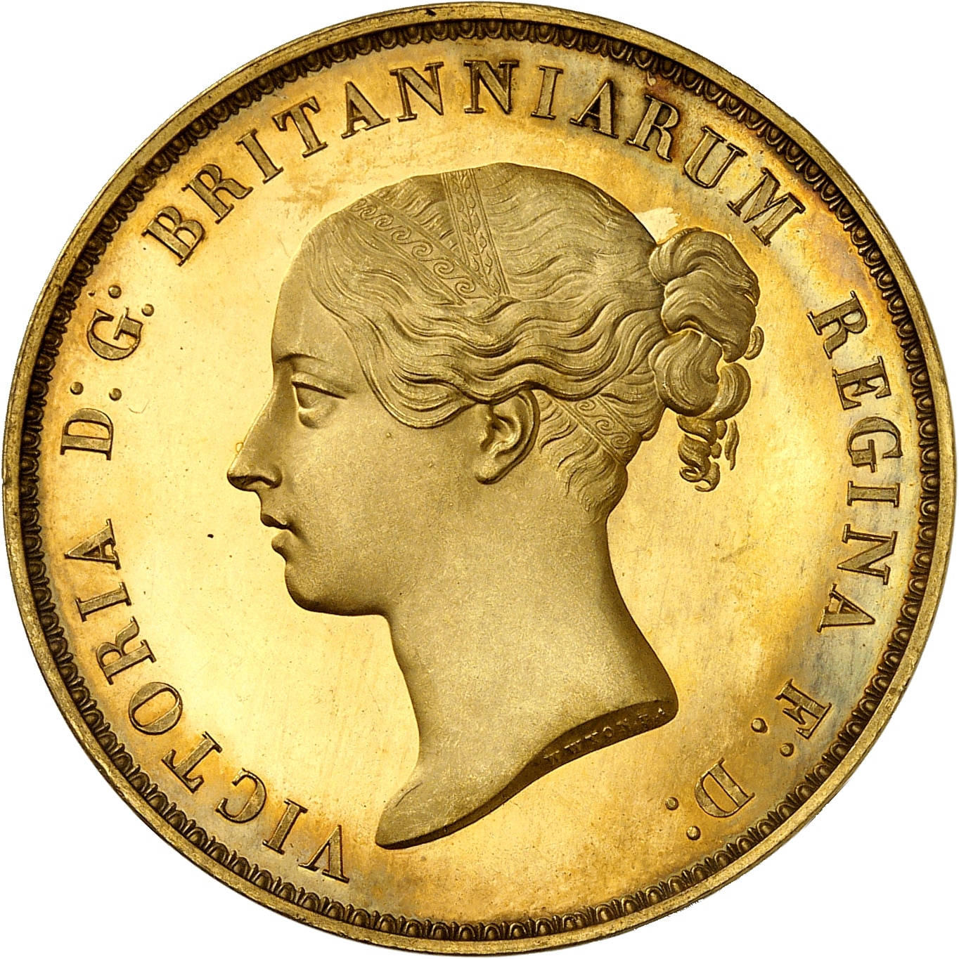 Av. VICTORIA D : G : BRITANNIARUM REGINA F : D : Buste à gauche avec bandeau dans les cheveux ; signature W. WYON R. A.