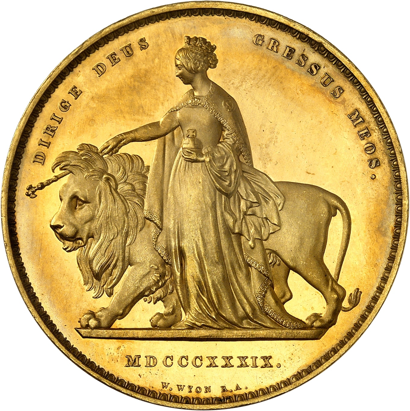 Rv. DIRIGE DEUS - GRESSUS MEOS. La Reine à gauche dirigeant un lion avec son sceptre ; à l’exergue (date) et signature W. WYON R. A.