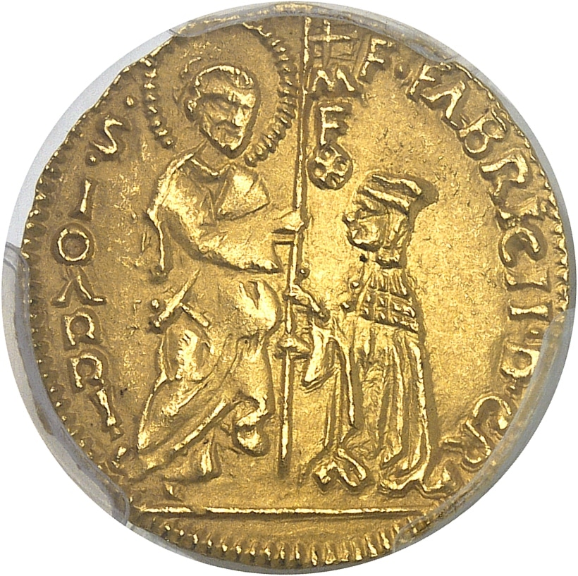 Av. F. FABRICII. D. GR / M F X et S. IOANNI Le Grand-Maître agenouillé devant Saint Marc nimbé, tenant ensemble un oriflamme de l’Ordre.