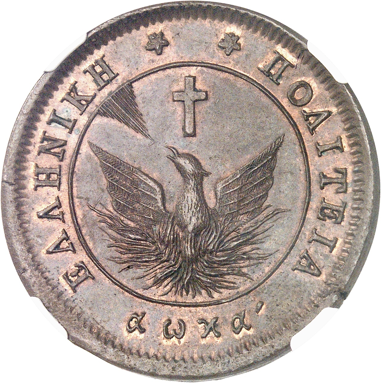 Av. ΕΛΛΗΝΙΚΗ ** ΠΟΛΙΤΕΙΑ / αωκα'. Le Phénix aux ailes éployées sous une croix.