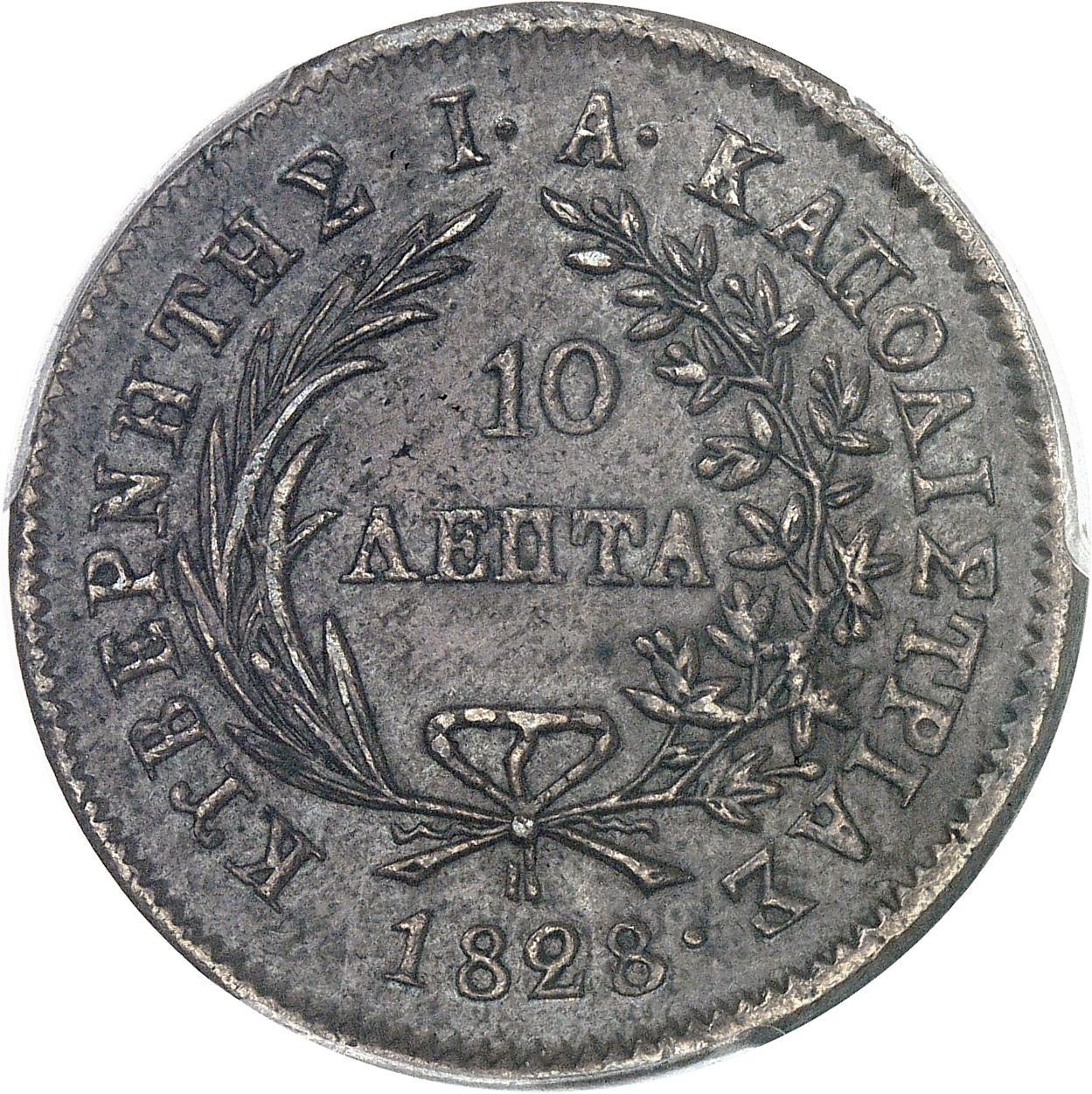 Rv. ΚΥΒΕΡΝIΤΗΣ Ι.Α. ΚΑΠΟΔΙΣΤΡΙΑΣ. Couronne formée de deux branches, au centre : 10 ΛΕΠΤA et à l'exergue (date).