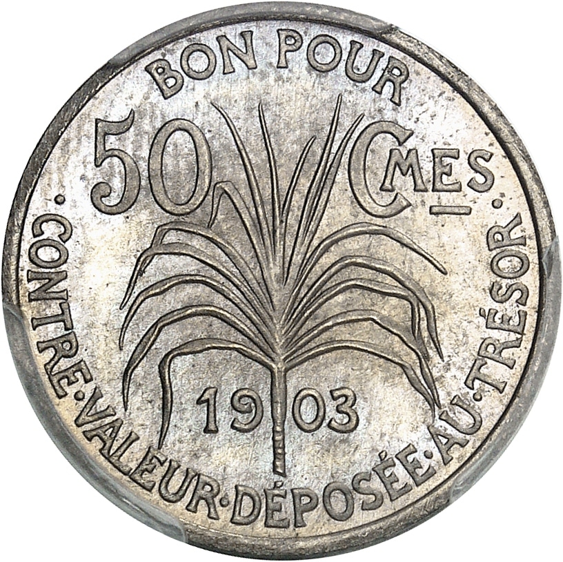 Seulement une vingtaine d’épreuves frappées en 1903 sur flan rond, toute valeur et variante confondue, pour M. de Lavergne, agent central des Banques coloniales