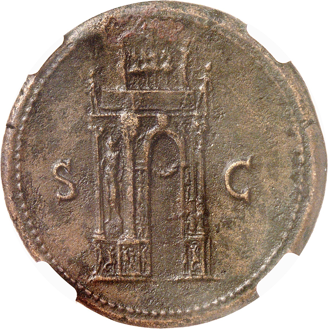 Rv. S/C. Arc de triomphe décoré, avec couronne de laurier, surmonté d’un quadrige dirigé par l’Empereur, entre la Victoire et la Paix, et deux soldats. Statue de Mars sur la partie latérale, avec une lance et un bouclier.