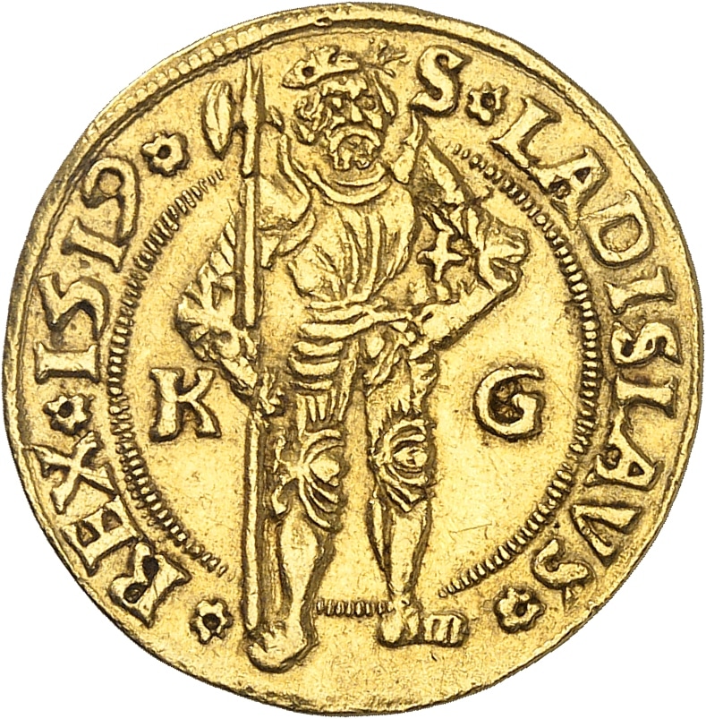 Rv. S* LADISLAVS* - ¨REX* (date)*. Saint Ladislas cuirassé et tenant une hallebarde, accosté de (atelier) et (différent).