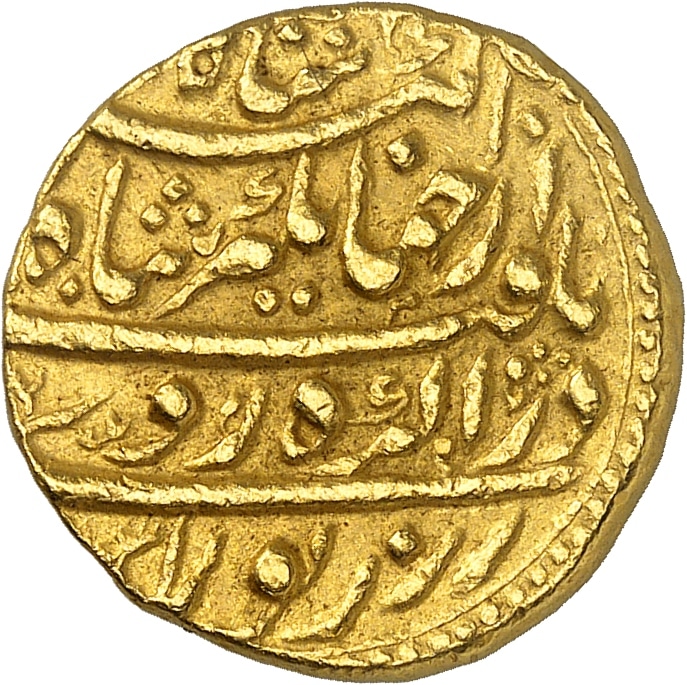 La date est peu lisible mais se devine avec le chiffre ٧ (7) de ١٧ (17) et ٣١ (31) de ١٠٣١ (1031). Frappé pour une dizaine de millésime, ce mohur existe en plusieurs variétés. Très rare. Avec une patine dorée. TTB à Superbe.