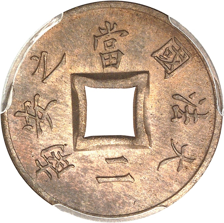 Rv. Perforation carrée centrale, autour caractères indochinois.