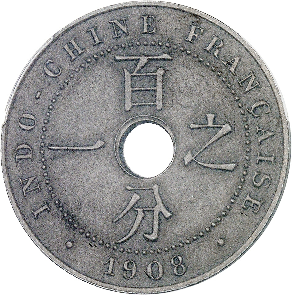 Rv. INDO-CHINE FRANÇAISE (date). Autour de la perforation centrale, caractères posés en croix.