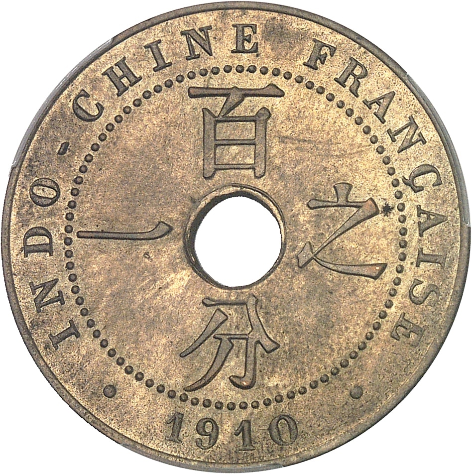 - FRENCH INDOCHINA IIIe République (1870-1940). Épreuve de 1 cent(ième), en cuivre jaune, Frappe spéciale (SP) 1910, A, Paris.