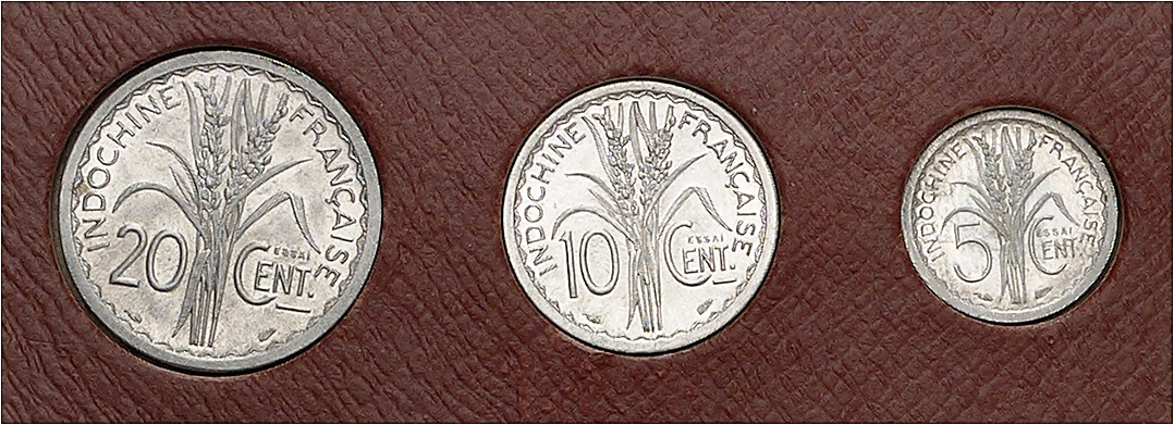 - FRENCH INDOCHINA Gouvernement provisoire de la République française (1944-1946). Coffret de trois essais de 5, 10 et 20 centimes 1945-1946, Paris.