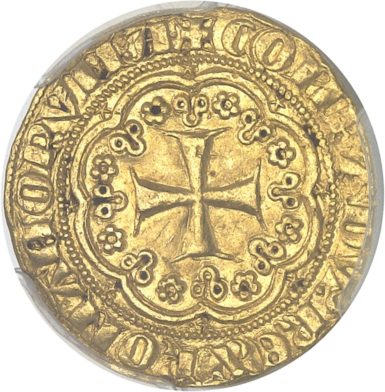 Av. +DVX: IANVENSIVM: PRIMVS: C. Portail génois dans un polylobe orné de motifs floraux.