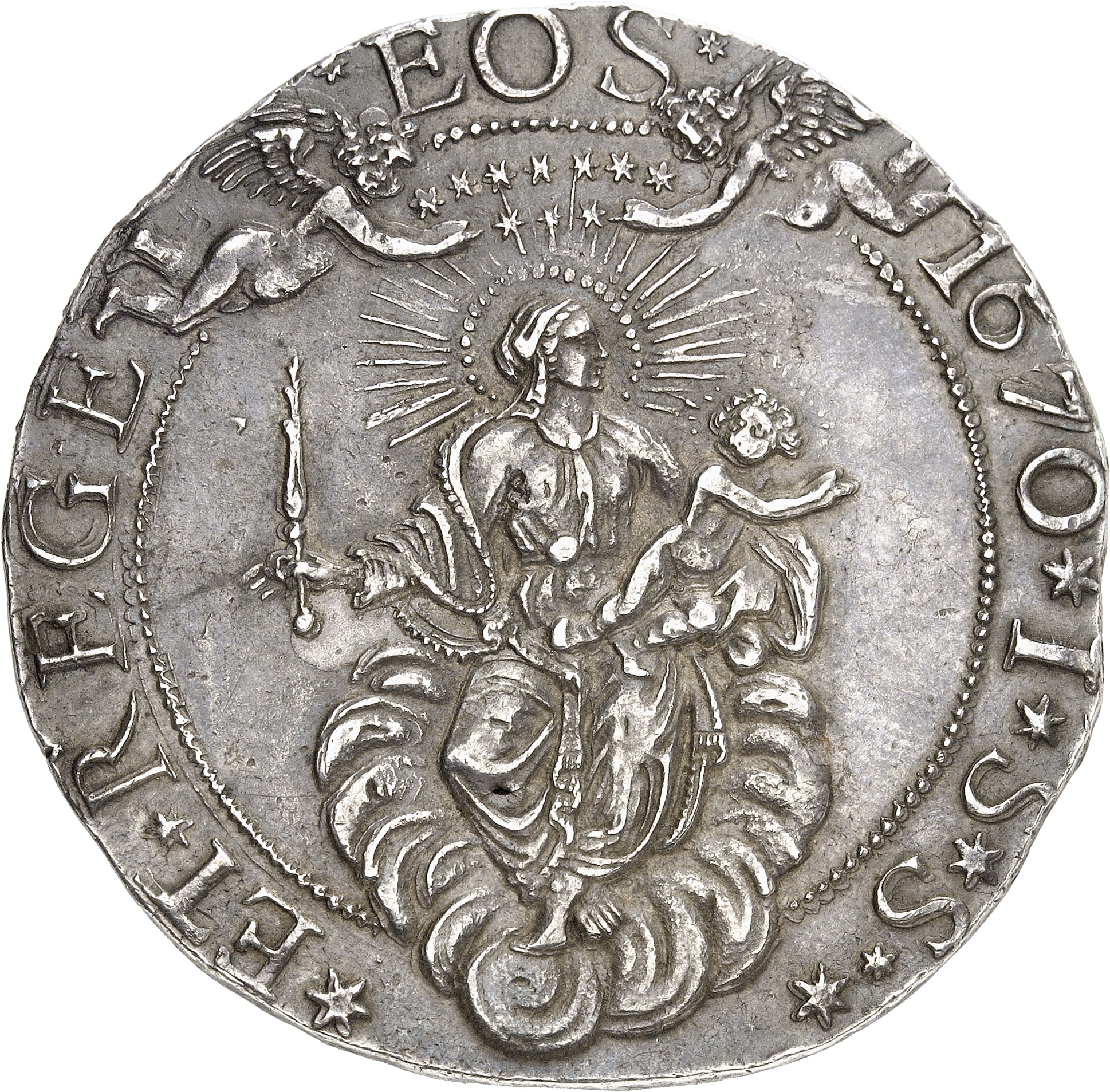 Rv. (à 6 h) *ET* REGE *EOS* (date)* (différent)*. La Vierge couronnée d’étoiles par deux anges, assise de face sur un nuage, tenant un sceptre et l’enfant Jésus.