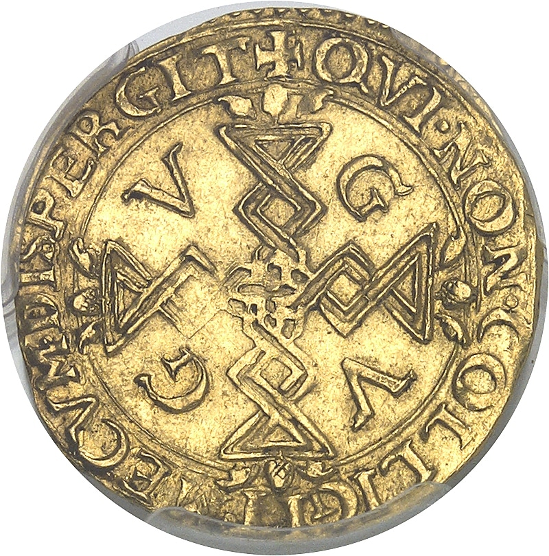 Rv. + QVI. NON. COLLIGIT. MECVM. DISPERGIT. Croix aux bras torsadés, terminés par des pommes de pin, accostée de G, V, V et G.