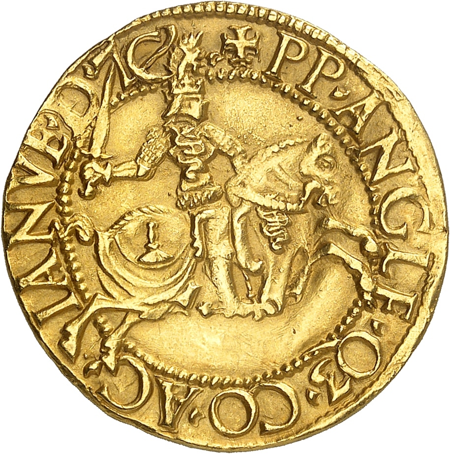 Rv. + PP. ANGLE. Q3. CO. AC - IANVE. D. 7C’. Le duc armé, à cheval à droite, avec casque à cimier orné d’un dragon ; le cheval avec caparaçon aux armes.