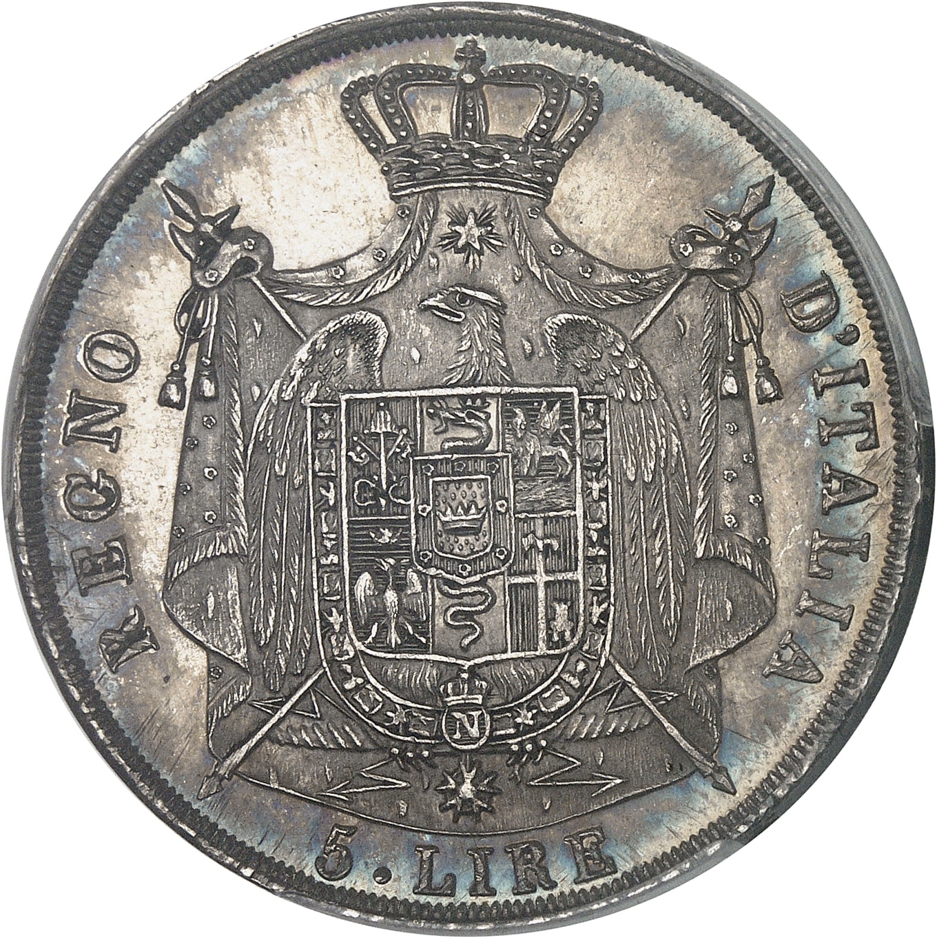 Rv. REGNO - D'ITALIA/ 5. LIRE. Aigle éployée portant un écu en cœur, posée sur deux hallebardes en sautoir, le tout sur un manteau couronné.