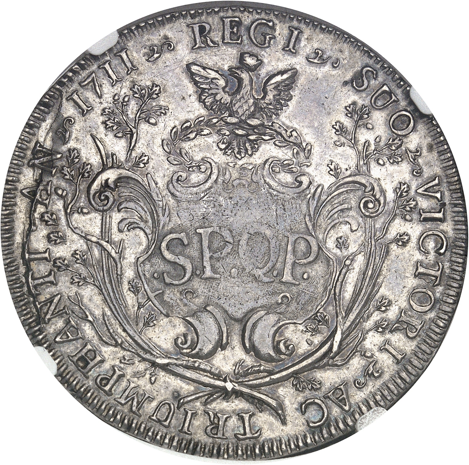 Rv. REGI * SUO * VICTORI * AC TRIUMPHANTI AN * (date). Dans une couronne formée de deux branches, cartouche rocaille surmonté d’une couronne avec un aigle couronné, inscrit S.P.Q.P.