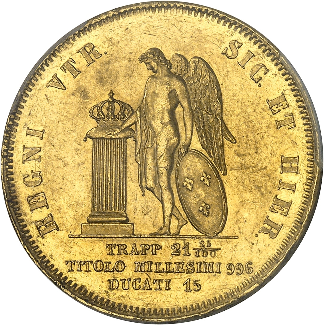 Rv. REGNI VTR. - SIC. ET HIER. Un Génie tenant un écu aux trois fleurs de lis de la main gauche, pose la main droite sur un autel où est posée une couronne ; à l’exergue : TRAPP. 21. 25/100 / TITOLO MILLESIMI 996 / DUCATI 15.