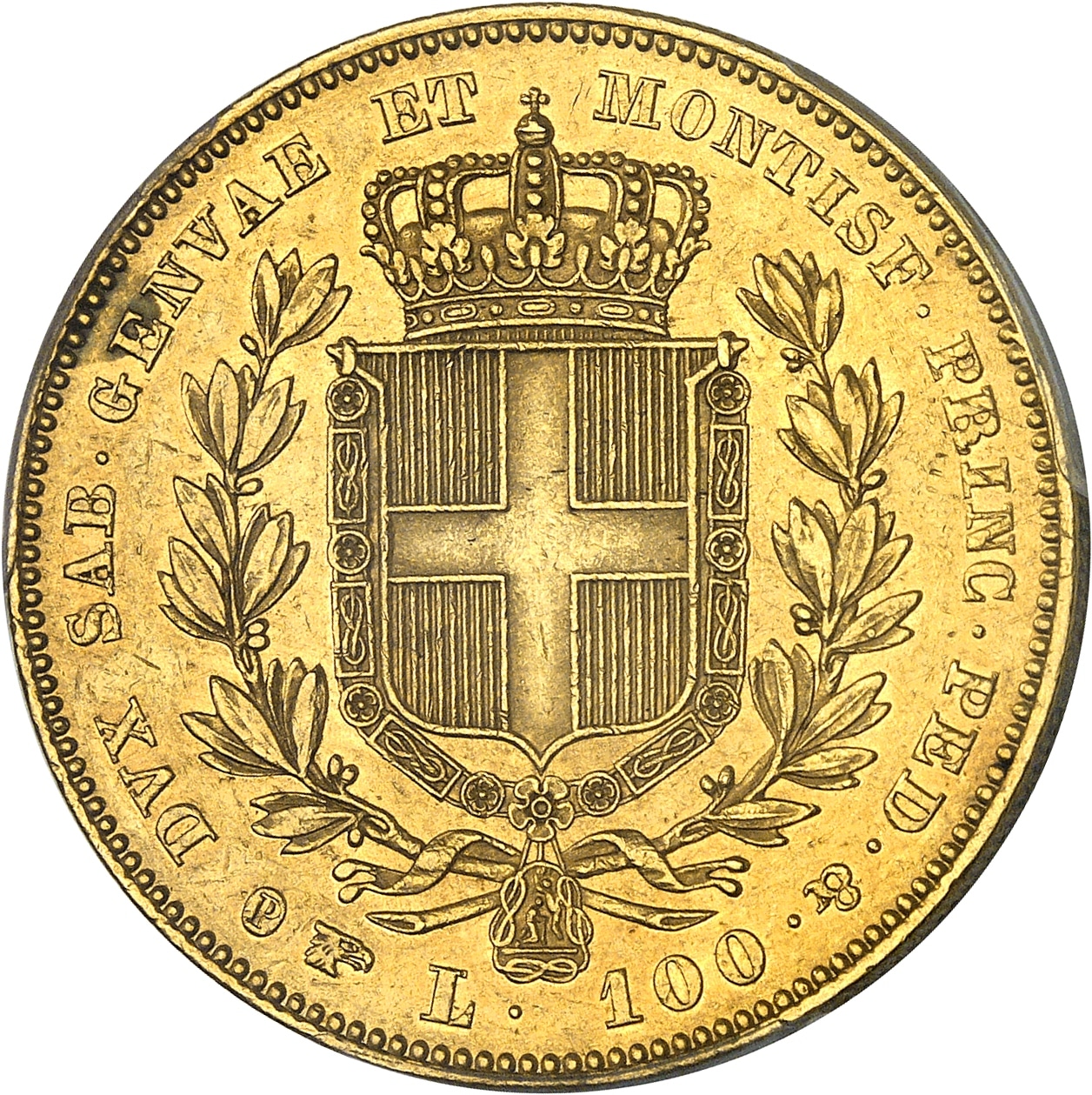 Rv. DVX SAB. GENVAE. ET MONTISF. PRINC. PED. &. Écu couronné dans une couronne formée de deux branches de chêne ; au-dessous (différent) L. 100. (atelier).