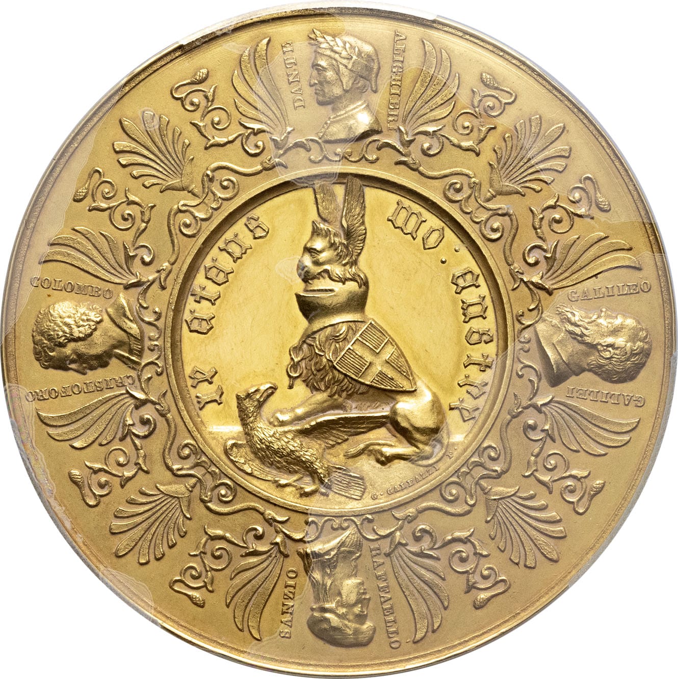 Rv. IE ETENS - MO: ENSTRE [Je atans mon astre]. Lion heaumé avec les griffes sur un aigle, entouré d'une fresque ornementale de palmettes, coupée par les bustes de Dante [DANTE ALIGHIERI], Galilée [GALILEO GALILEI], Raphaël [RAFFAELLO SANZIO]et Christophe Colomb [CRISTOFORO COLOMBO] ; signature G. GALEAZZI F.