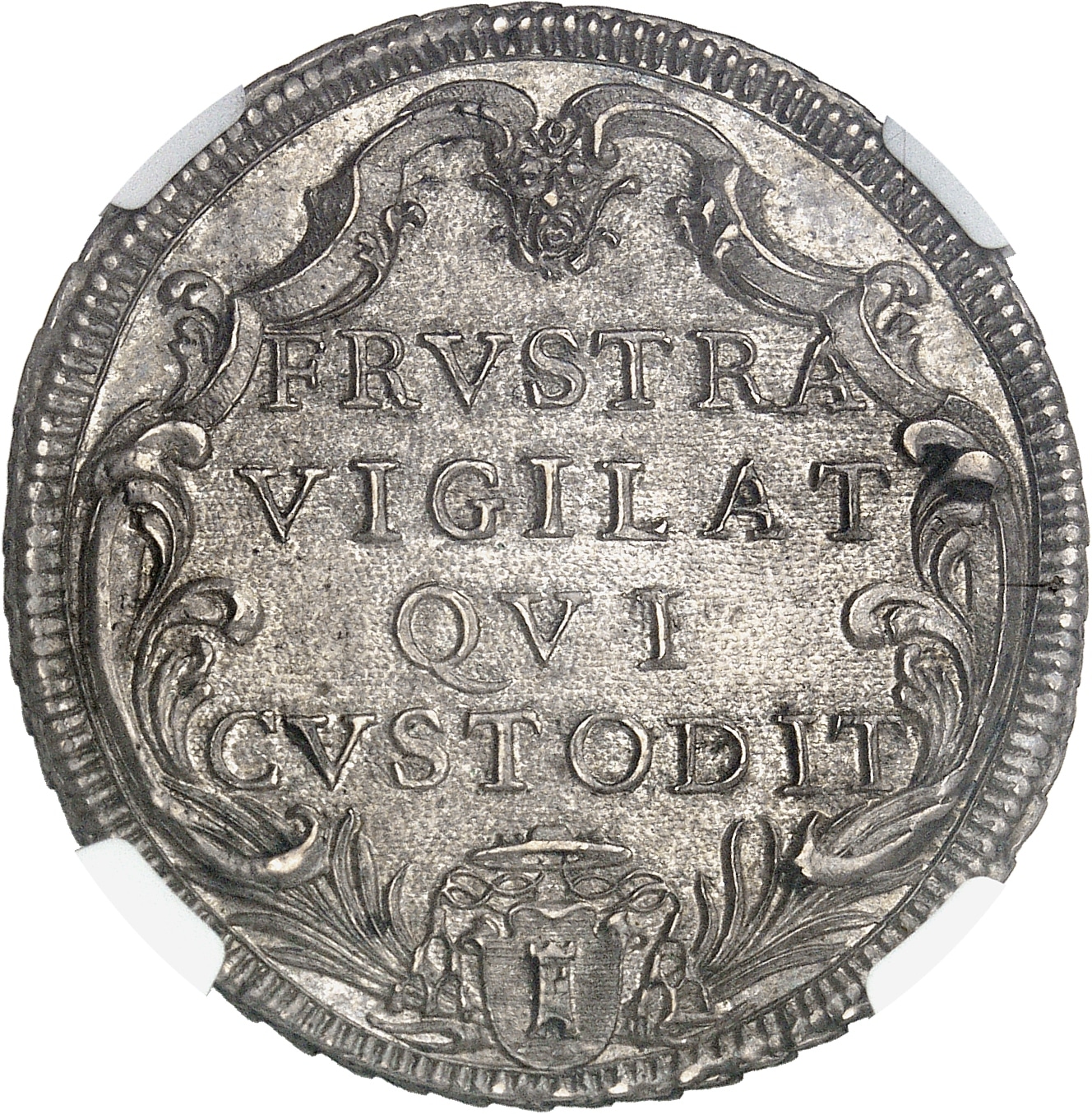 Rv. Dans un cartouche festonné, avec deux palmes et écu surmonté des attributs du prélat : FRVSTRA VIGILAT QVI CVSTODIT.