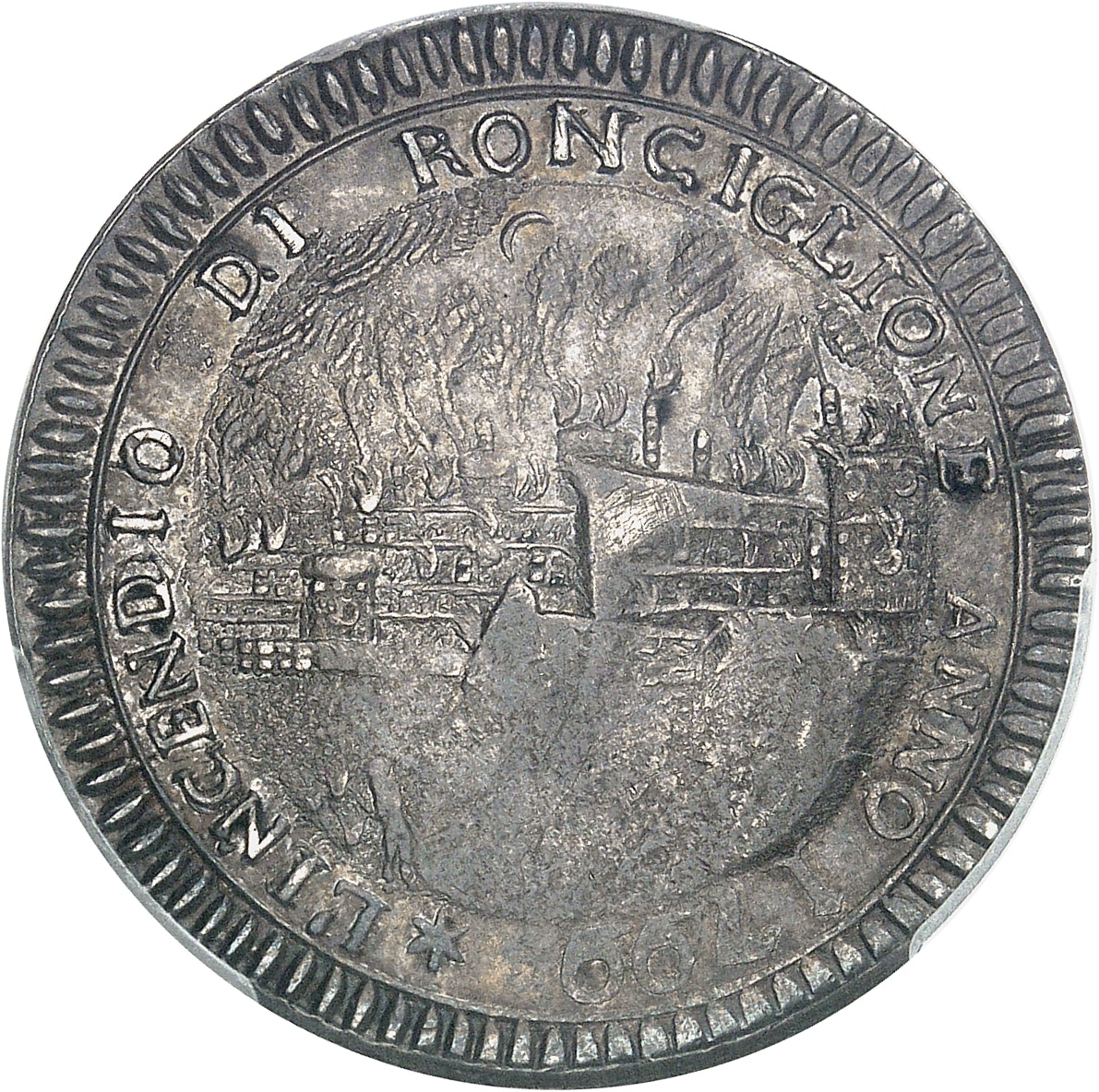 Rv. * L’INCENDIO DI RONCIGLIONE ANNO 1799. Vue de la ville de Ronciglione durant l’incendie ; au-dessous (différent).