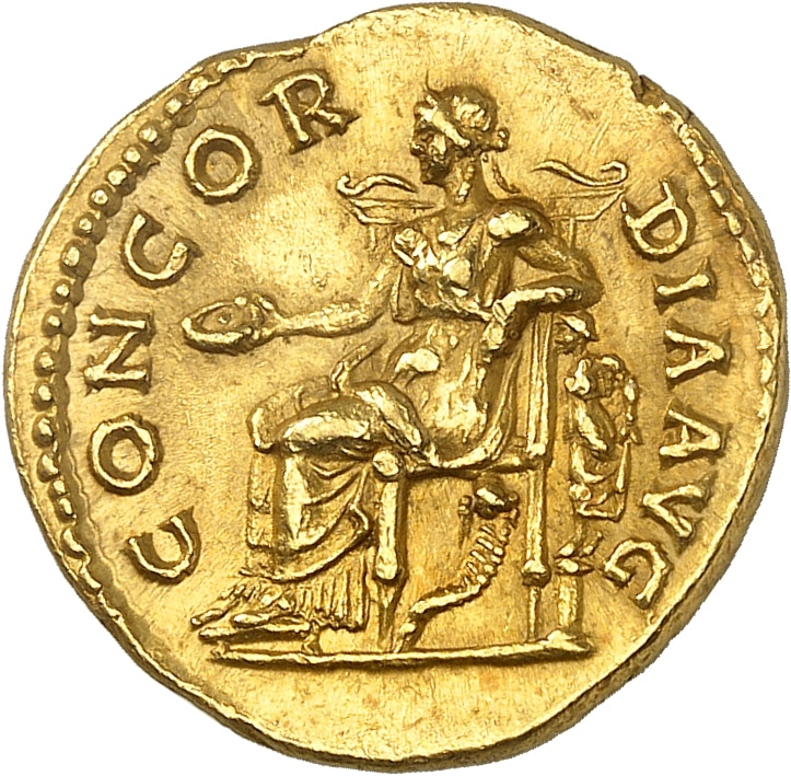 Rv. CONCOR - DIA AVG. La Concorde assise à gauche sur un trône et tenant une patère ; une corne d’abondance sous le trône.